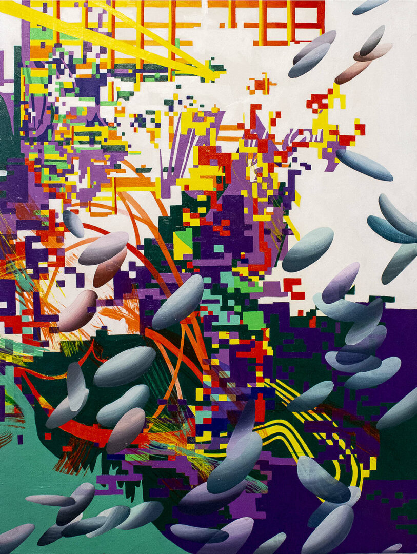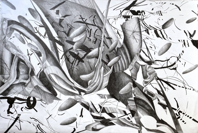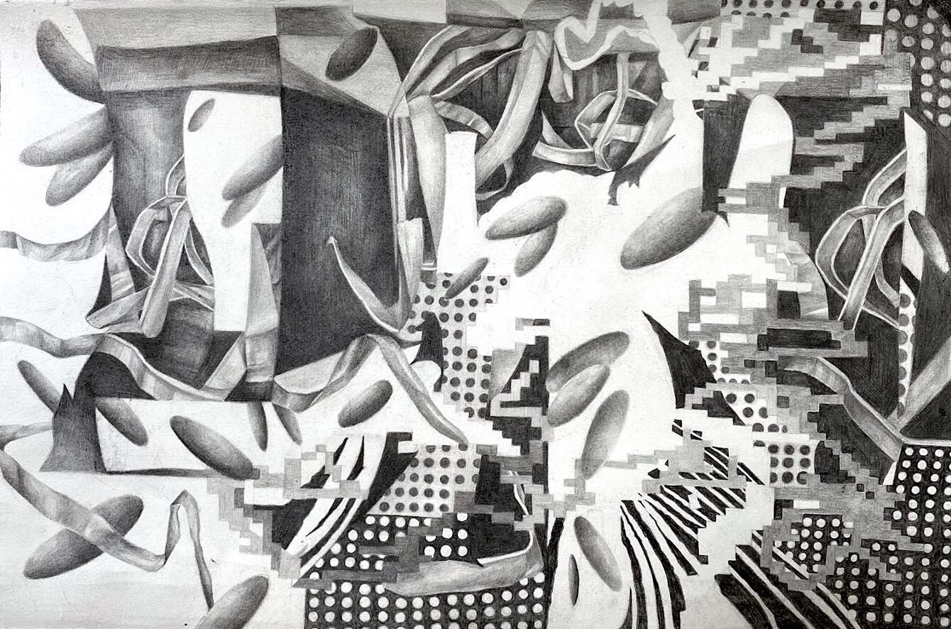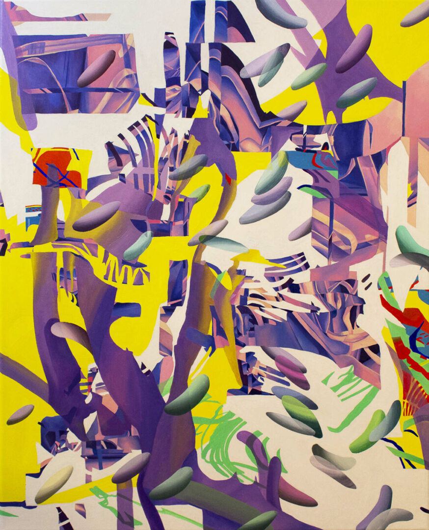 A lot of my artwork is about how chaos interacts with space. I create complex drawings and paintings using lines, colors, and shapes that are manipulated and then erased or destroyed. I am fascinated by unclearness and the surprise that occurs, creating an exciting and organic finish. In all my work, the repetition of “rock” figures symbolizes a familiarity that I hold onto. It’s an essential aspect of the compositions because they are like living, breathing forms intersecting in the chaotic space, creating movement.