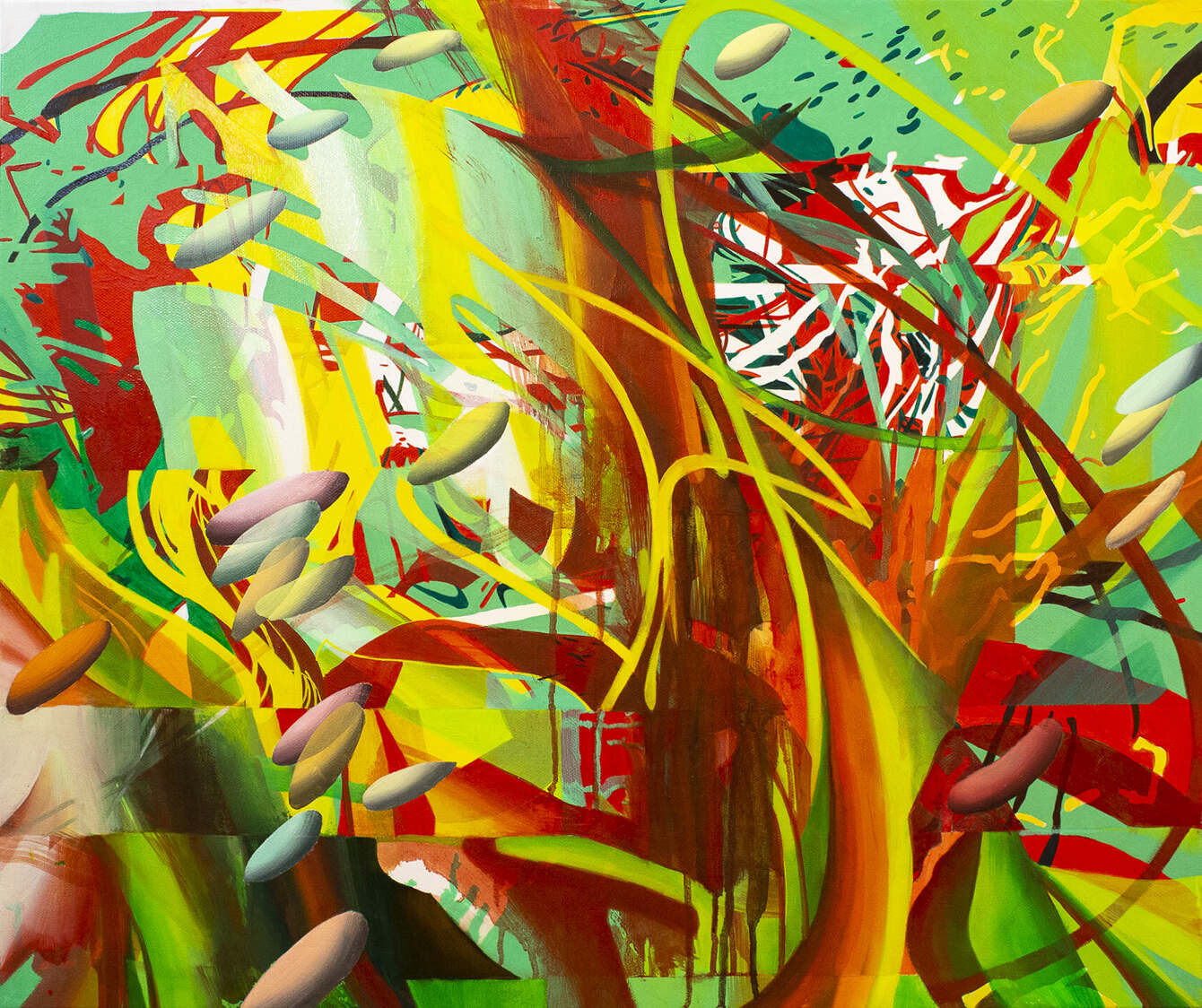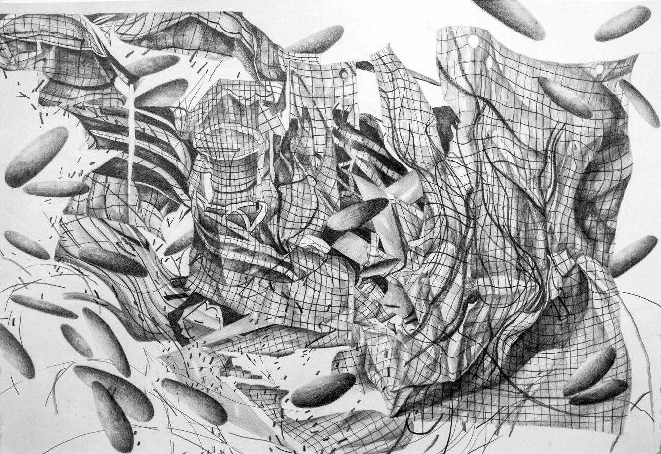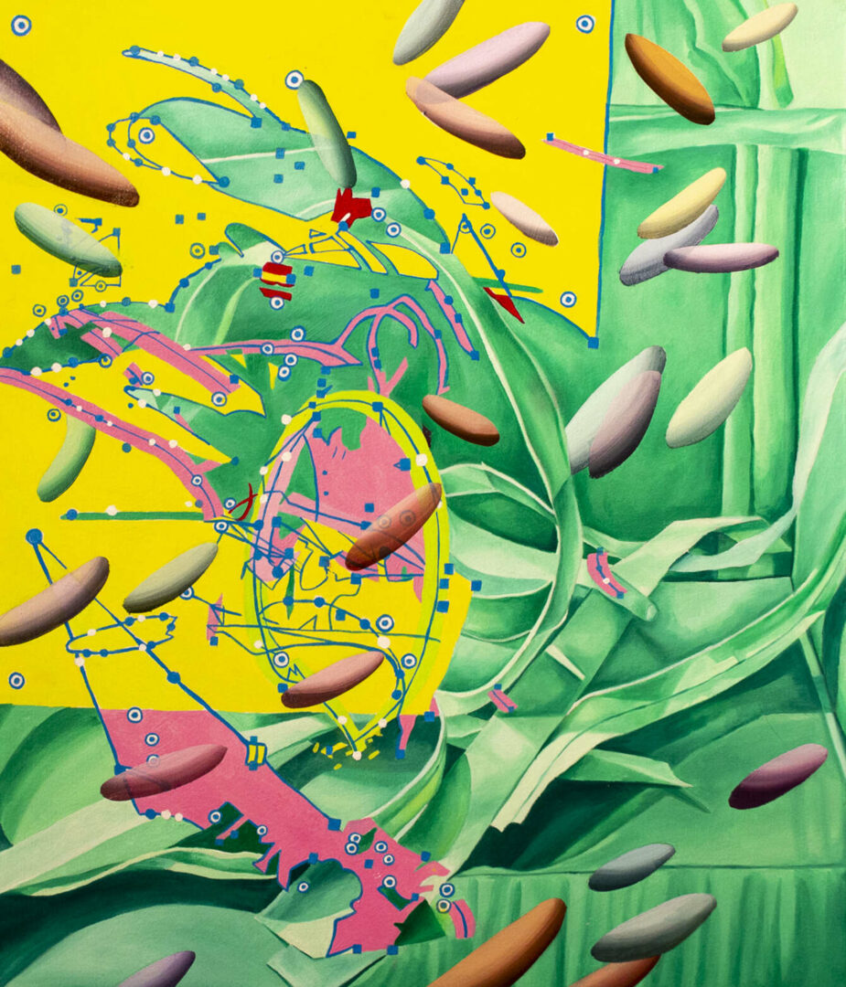 A lot of my artwork is about how chaos interacts with space. I create complex drawings and paintings using lines, colors, and shapes that are manipulated and then erased or destroyed. I am fascinated by unclearness and the surprise that occurs, creating an exciting and organic finish. In all my work, the repetition of “rock” figures symbolizes a familiarity that I hold onto. It’s an essential aspect of the compositions because they are like living, breathing forms intersecting in the chaotic space, creating movement.
