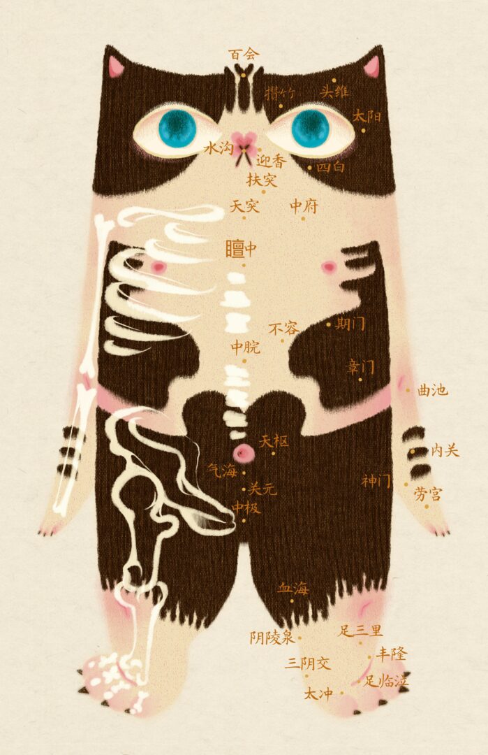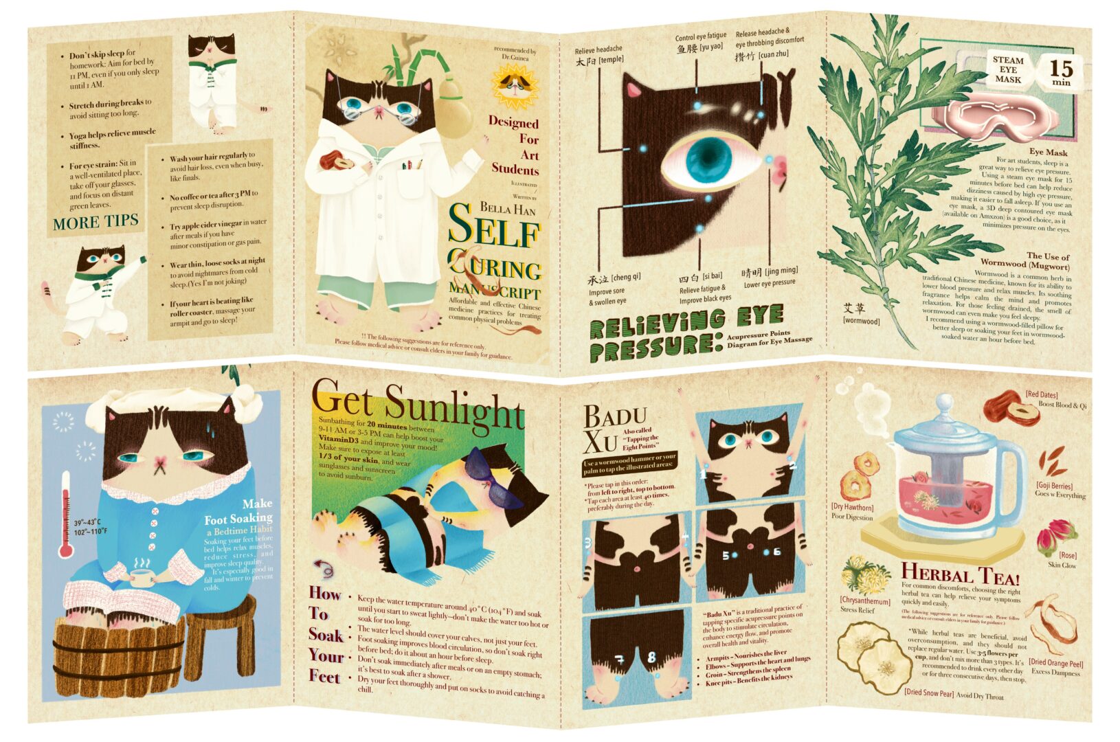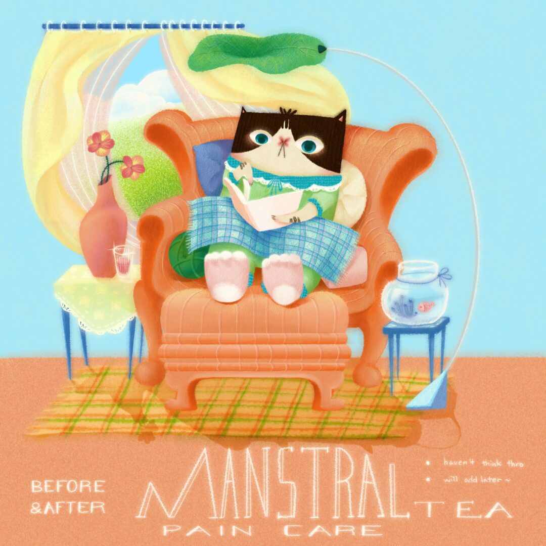 So far, I created a character—a chubby tuxedo cat with cow-like spots. Centered around this character, I’ve designed a zine called “The Self Curing Manuscript For Art Students”. Along with it are ilustrations for six types of flower and herbal teas—each designed for one common diseases art students tend to have.