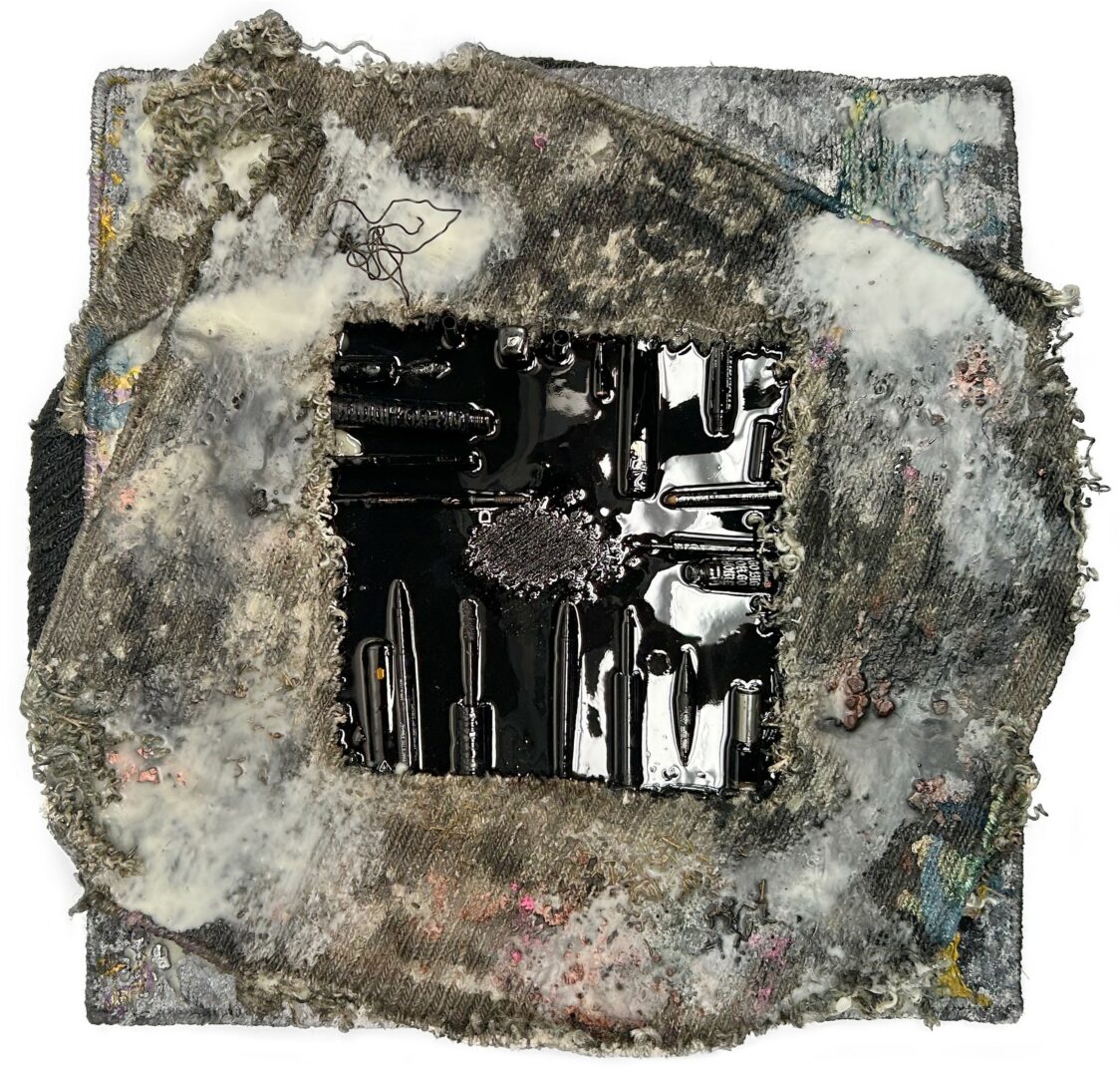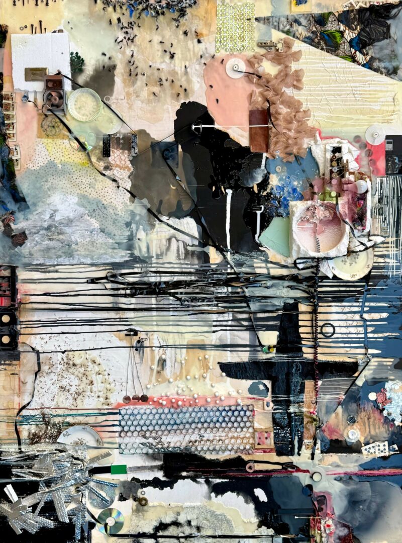 I am primarily a painter, although much of my current work contains very little paint. I use an extensive array of materials to create highly textural pieces, and I love to push the boundaries of what can be effectively used as art medium—makeup, expired medication, old letters, packaging material, shattered CDs , other fragments of obsolete technology.. What I’m really doing is exploring the emotional resonance of these abandoned objects. I use primarily wax and resin to hold everything together on wood panels that range in size from the miniature to massive. My largest finished piece is eight feet wide and six feet all, and I hope to go much larger one day.