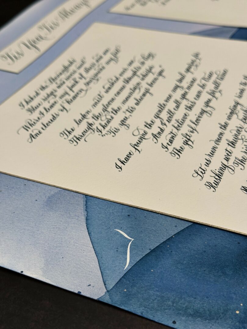 What excites me most is how personal this work is. On-site events give me the chance to connect with people face-to-face, and I love the energy of those moments. But there’s something truly special about custom work. More than once I’ve been moved to tears while finishing a piece, knowing it will become a meaningful keepsake in someone’s home or family. That’s an incredible honor. I think what makes my work unique is the blend of traditional calligraphy foundations with my own style—I bring a consistent thread into each piece, whether it’s through my lettering or the watercolor accents I love to include.