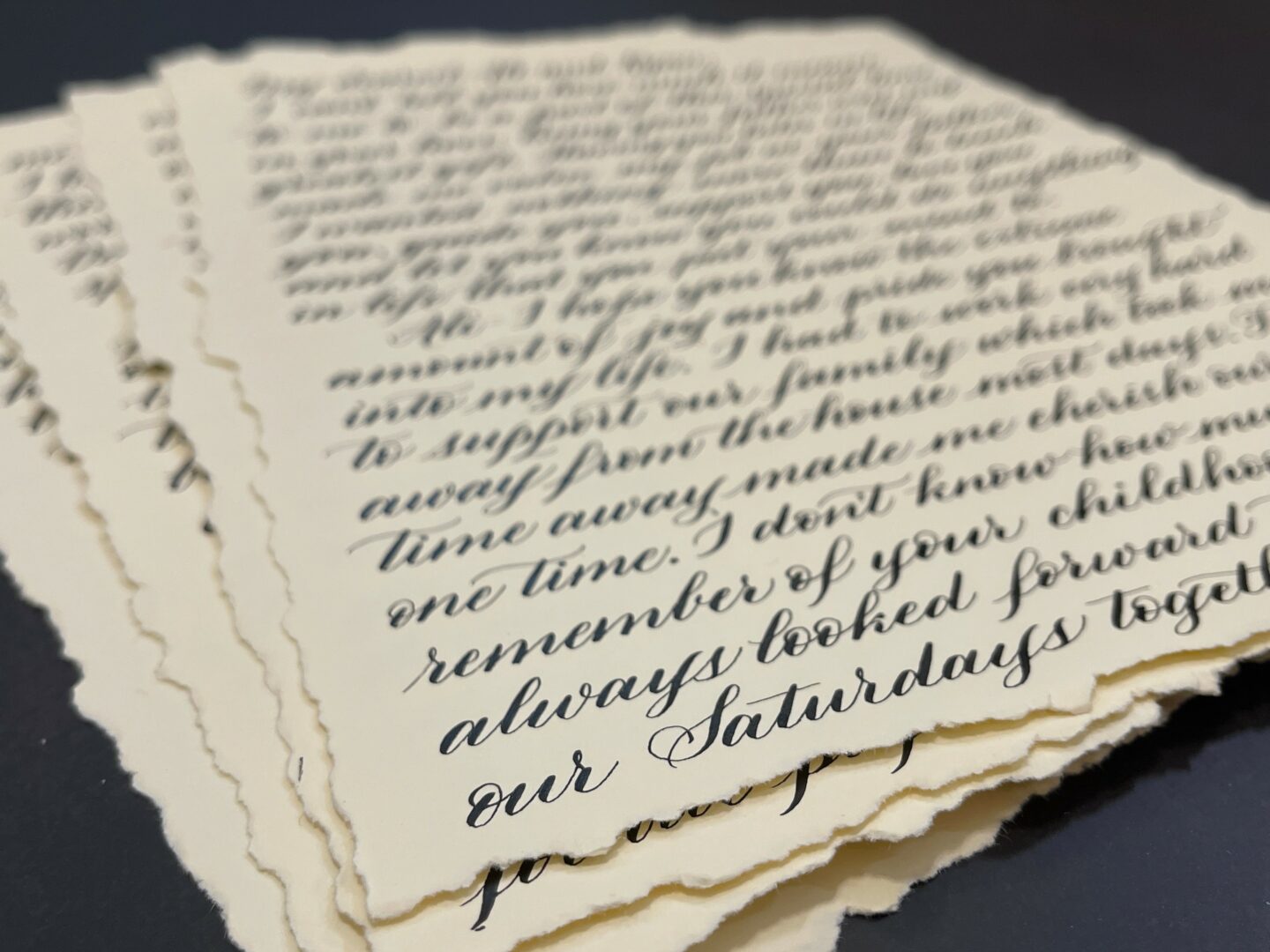 I discovered calligraphy by chance in 2019 while I had some down time to fill. I had no idea at the time how big and beautiful the world of calligraphy really is! I started with a simple beginner’s kit and a $25 online class, and quickly found myself immersed in endless possibilities—different scripts, inks, styles, history, and most of all, a wonderful community of people who share a love for the art. My turning point came when an acquaintance asked me to write a letter for her to give her husband on their wedding day. That was my first paid project, and I had so much fun with it that I knew I wanted to keep going and create more opportunities to share my work.