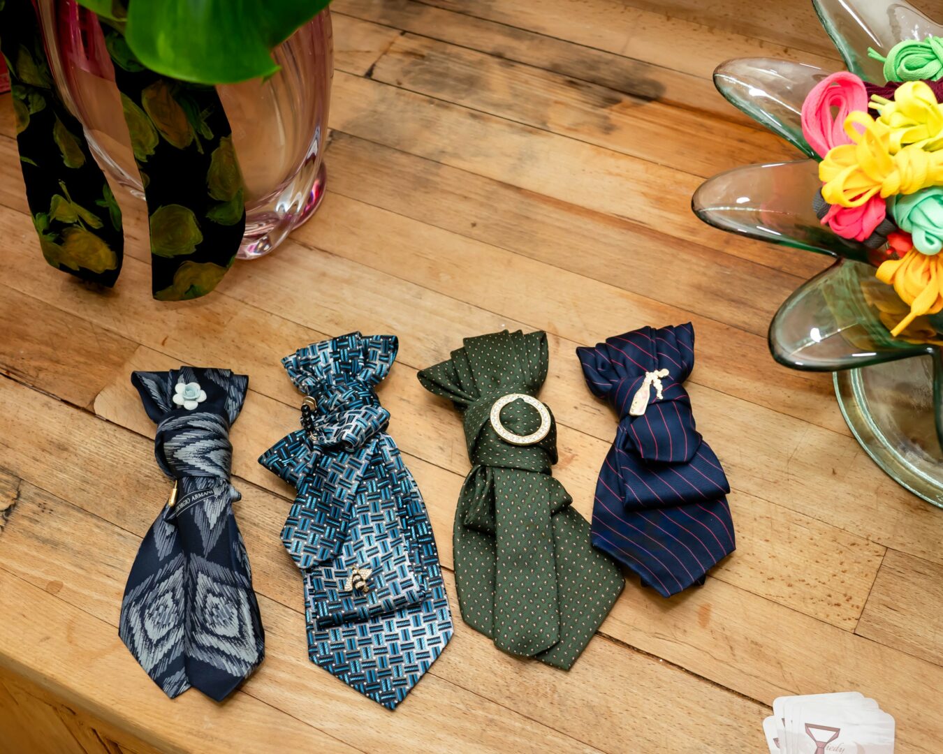 As a duo-owned business, one of the most important things we’ve learned is not to put pressure on ourselves to “force” creativity. Since we live in separate states, we’ve embraced the rhythm of working apart while still staying deeply connected. Our creativity comes alive when we share our love for fashion and self-expression through our upcycled ties and custom pin designs.