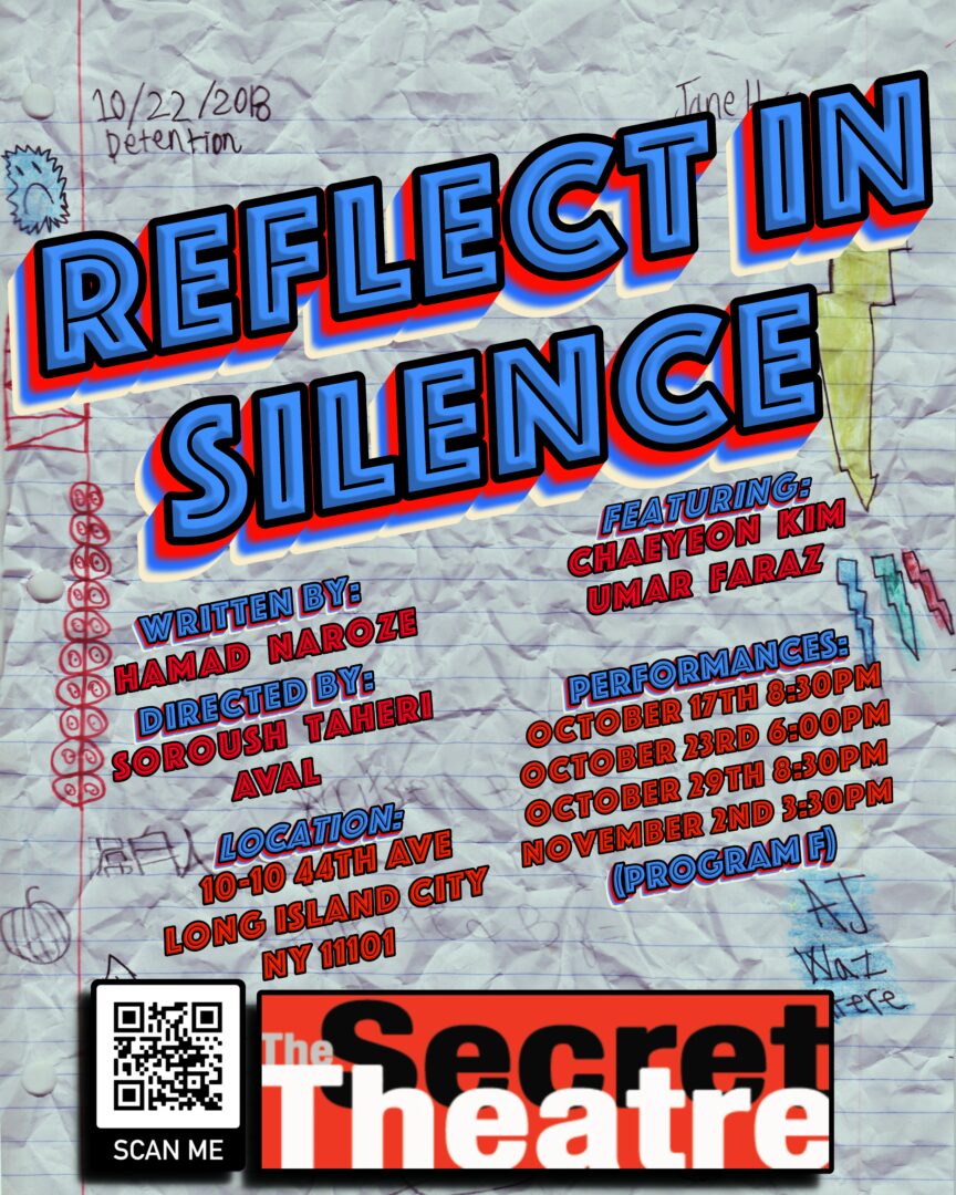 From Pakistan to New York, I have always felt a fascination for storytelling, even graduating with a BA in “Story Crafting” from CUNY Baccalaureate for Unique and Interdisciplinary Studies ’25. Starting college as a Muse Scholar and graduating as a Thomas W. Smith Academic Fellow has helped me keep my artistic interests, whether they be video games, film, or theater, in line with my academic goals, always learning something new to then make something newer. It was also at Hunter College that I officially became a playwright when one of my short plays was read on stage in front of a live audience. Since then, my works have been performed at the LaGuardia Performing Arts Center’s Rough Draft Festival and Horizon Theater’s New South Young Playwrights Festival. Recently, I just completed a run of my play “Reflect in Silence” in The Secret Theatre’s Fall Short Play Festival. During the production, I got to work with Soroush Taheri Aval, a director from Iran, and two great Asian-American actors, Umar Faraz and Chaeyeon Kim. The play follows two Asian-American middle schoolers who are stuck together in detention, a studious student and the class clown, and find out that in America, they’re more alike than not.