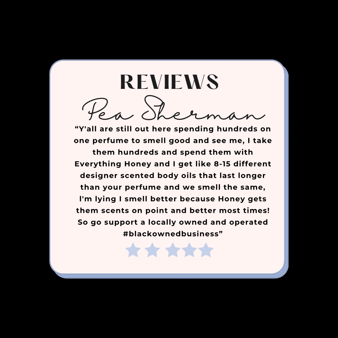 I am known as “Honey” aka Your Favorite Oil Lady! I am a young female entrepreneur from Detroit, Michigan where Everything Honey, LLC was born. A business known to be a “Jack of all trades”. Everything Honey is growing rapidly and I’m forever grateful for that! I am known for producing some of your favorite perfumes & colognes in the form of long lasting, potent & premium body oils. I have loved smelling good since I was 9 years old. I think the most important thing about my brand is that it gives a sense of confidence. When you smell good, you feel good.