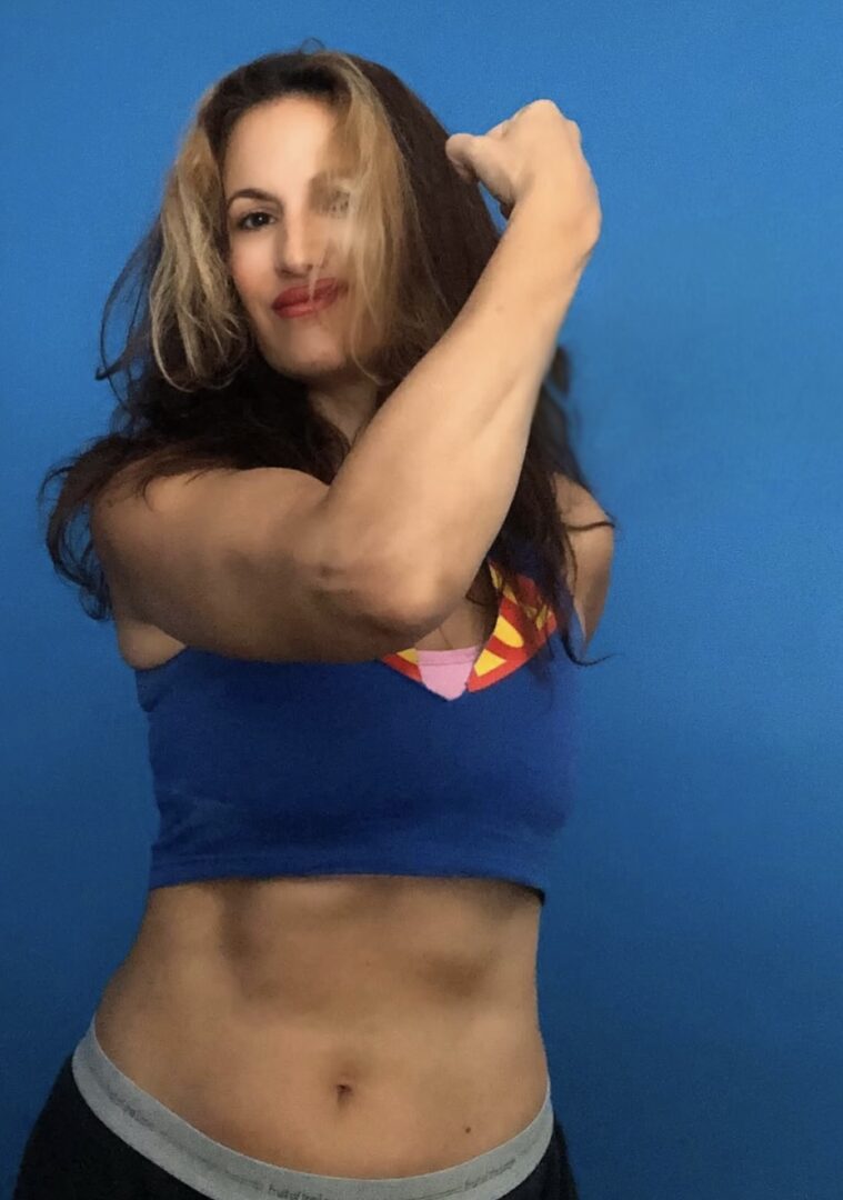 “Mental health issues have VIP passes in my family—but that wasn’t what lit the fire under me. I’d always been a little chubby, and I grew up in the ‘80s, where the more emaciated you looked, the more people applauded you for your ‘willpower.’ I decided ‘nothing would come between me and my Calvins, ’ not even low self-esteem. So, with zero qualifications and much audacity, I applied to be an aerobics instructor at a local gym. A few grapevines and high kicks later, my body and brain got a total makeover. It was a new and long path that would lead to a lifelong career as a fitness instructor and trainer—the three most essential qualities of a fitness teacher are LOVE, EDIFICATION, AND PATIENCE. I taught for 40 years at Lucille Roberts and various other gyms, and was even awarded best NYC class twice for my weight training and kickboxing class at Lucille Roberts. This was amazing. There are hundreds of gifted instructors, extraordinary classes, and gyms; achieving that honor was pure sublimity. They typically only award the plaque once, but I received it twice. I also continued to train on Zoom throughout COVID when it was very needed. I still train comedians, celebrities, and civilians alike. I go wherever I’m needed. Fitness has always been my solid day side-hustle throughout my career as a standup comedian. I love what I do day and night! Spread wellness during the day. Spread laughter at night.”