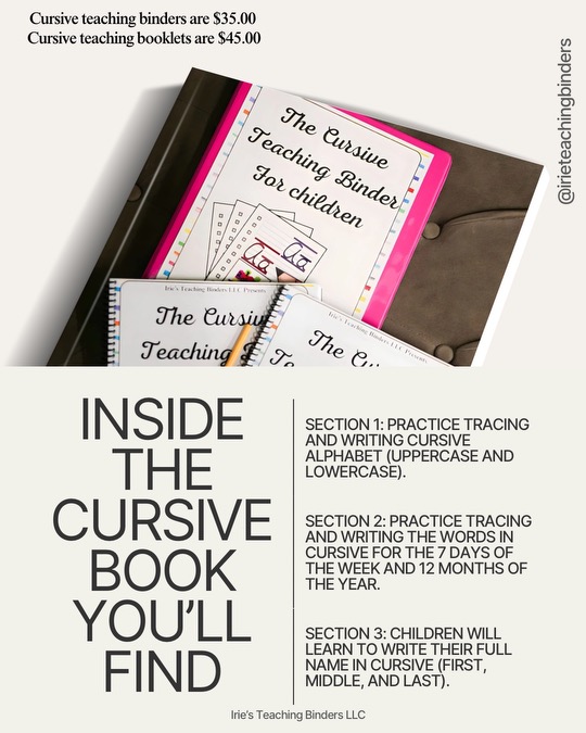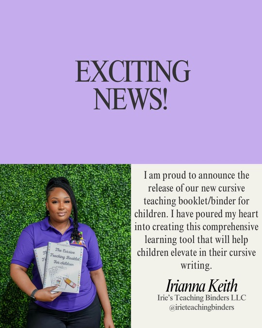 Hello, I am Irianna, owner of Irie’s Teaching Binders LLC, a business dedicated to providing learning resources for children aged 1-13. Our hands-on learning tools are designed to foster growth and advancement in their education. Our products are versatile and can be utilized at any time and anywhere. Our company is known for our best selling customized teaching binders for children. We have recently launched our Cursive teaching book for children and will soon offer tutoring services to elementary and middle school students.