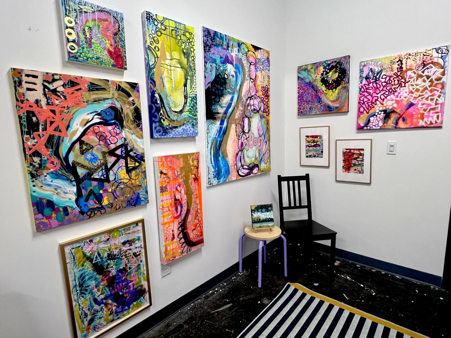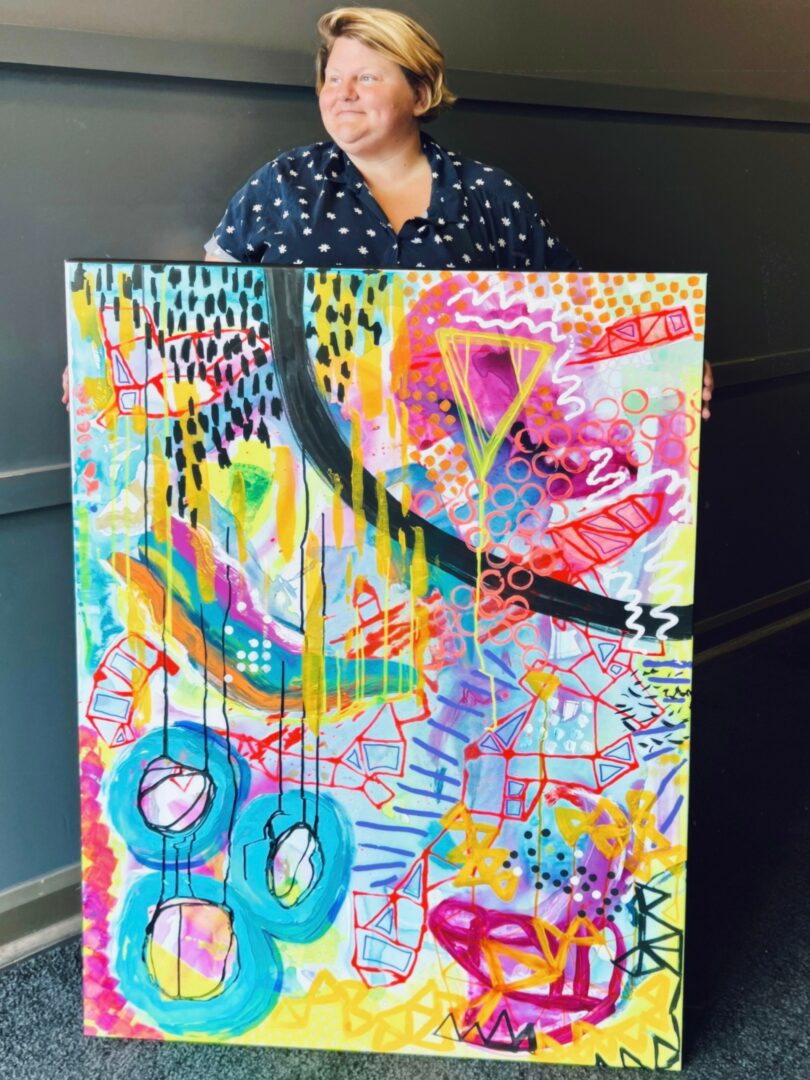 My time painting allows my brain freedom to be itself instead of trying to be the perfect model that someone else tells me to be. I paint patterns and layers in short bursts so that my nervous system and muscles release residual anxiety, allowing my calmer brain enough to think with a level of clarity that I haven’t experienced before. I don’t quite know how to describe how that has changed my life over the past two years except this; 1. My physical health is the best I’ve ever had in my adult life and I see no sign of that continuing to improve. 2. I have a clarity of what I need in my life, versus what I want. 3. I’m able to set boundaries to protect my energy. 4. My confidence has skyrocketed in so many areas of my life, all of which came after my first art show. 5. My confidence, combined with a lot of therapy, has led to clarity of my personal goals and how to get to them.