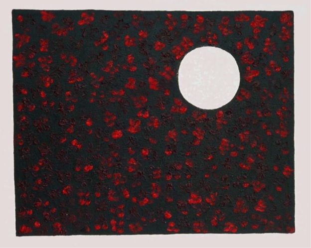 Then, a vision came to me — not in words, but in the form of art: red flowers blooming against a dark sky, and a white sphere that glowed like the moon. Something inside me whispered, “You have to paint this.”