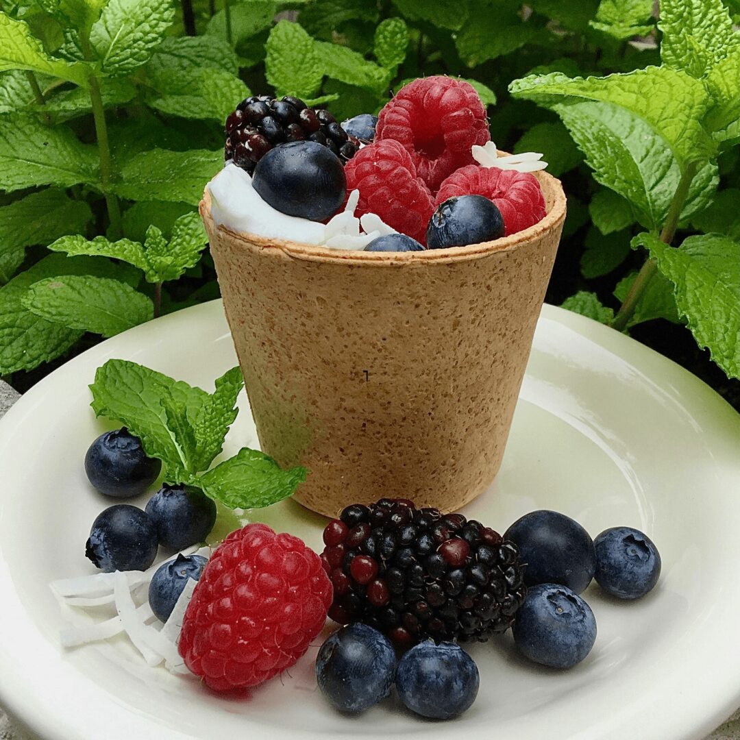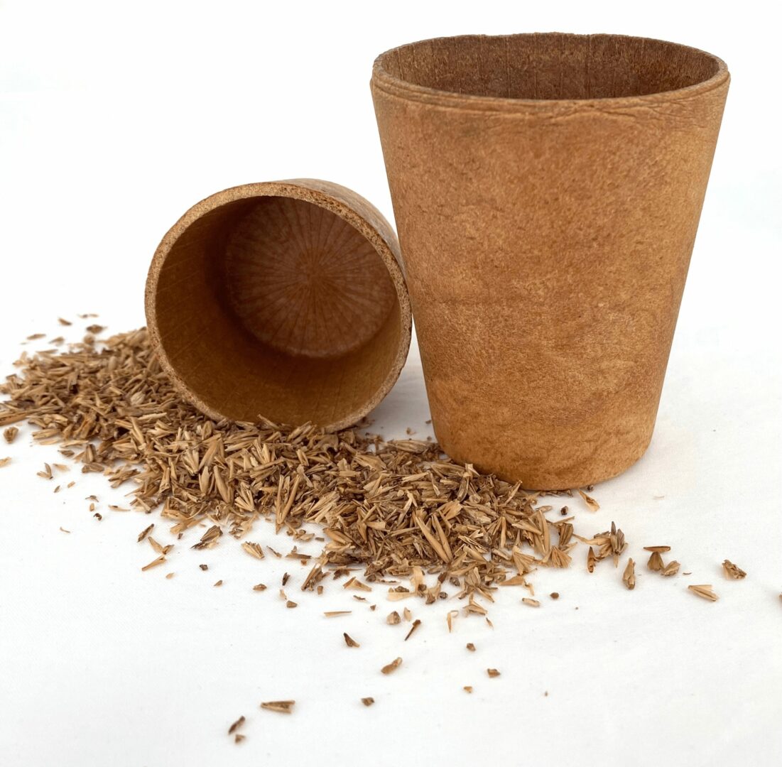 We had heard about the process of upcycling spent grain, and this got us thinking- what if we could make the cups using recovered grain from local breweries? We joined the Upcycled Food Association and received a quick education about how to upcycle spent grain in a food-safe way. I started baking trials in my kitchen using a waffle cone maker and after extensive experimentation it was time to test cup-making in a real food production lab. The result? A patented recipe and process that yields cups that are delicious, nutritious, stand up to boiling water, and provide a unique and fun sustainable snacking experience!