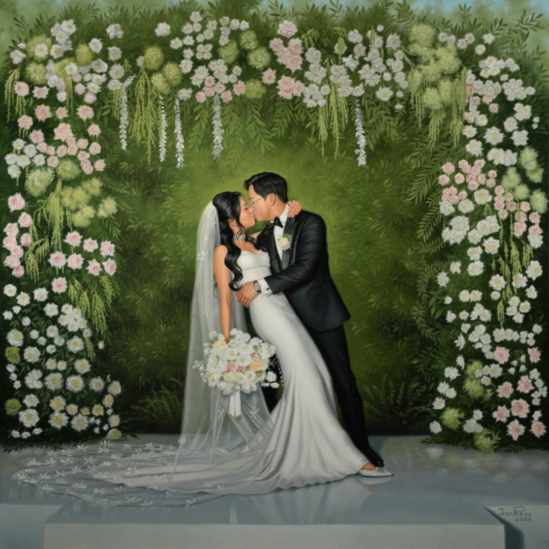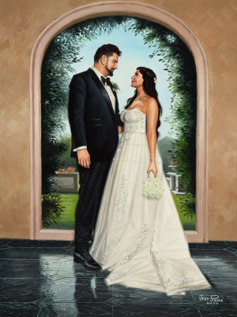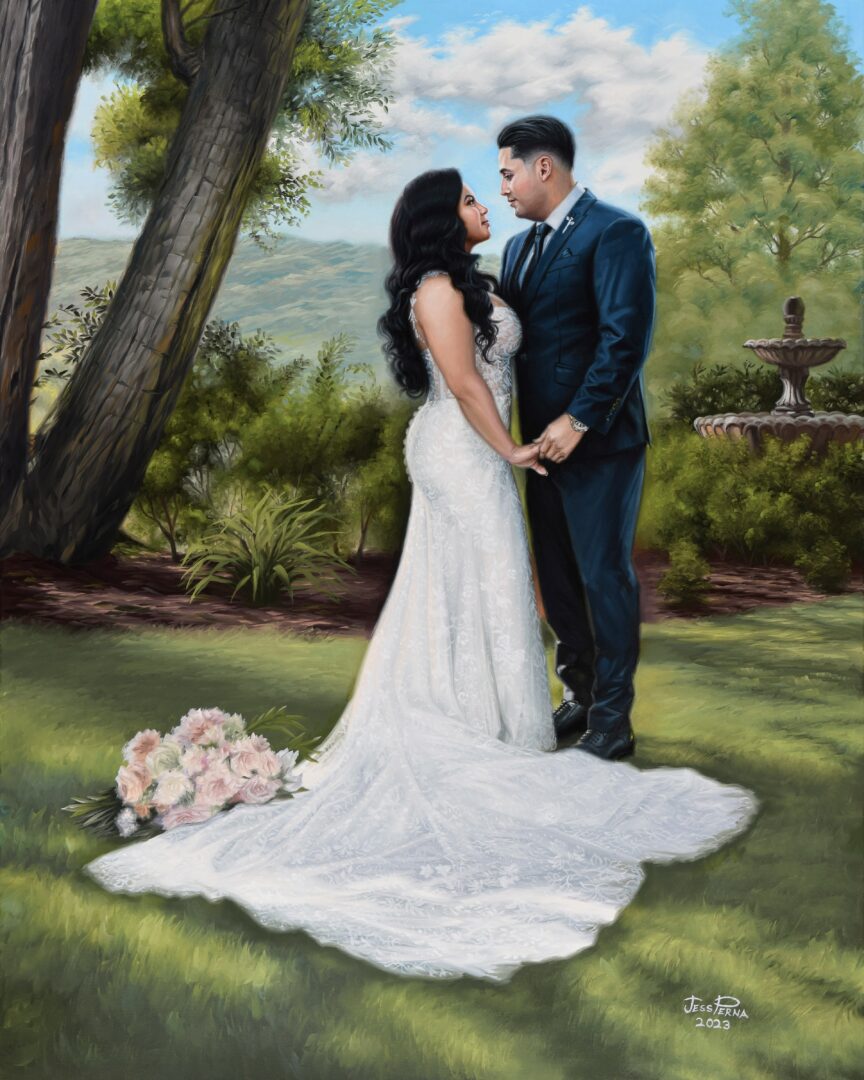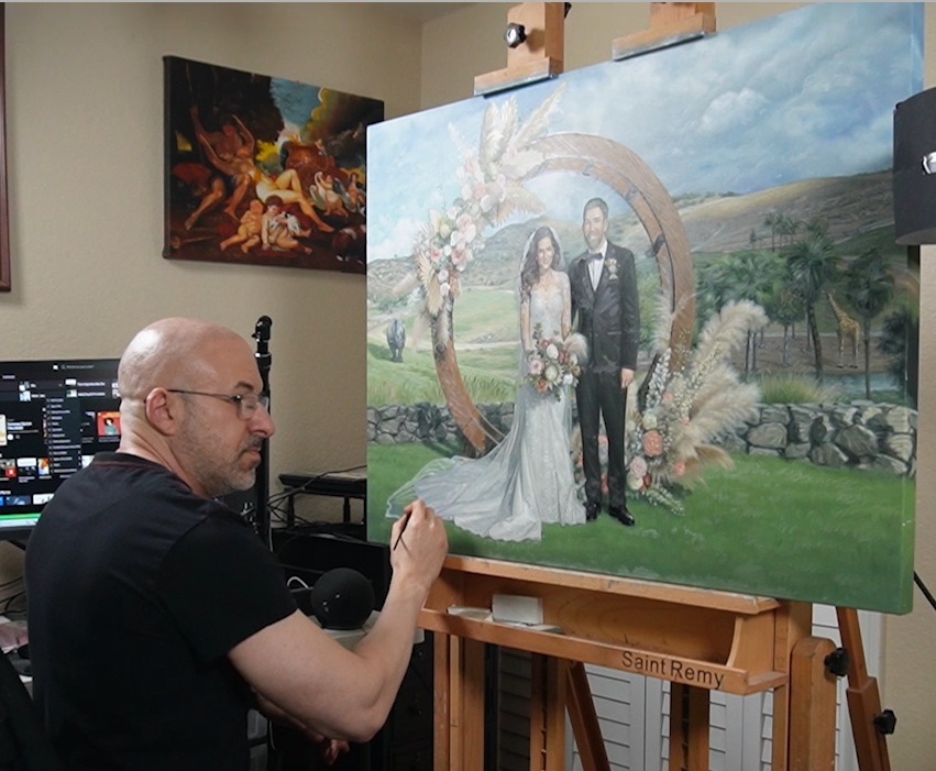 I have been commissioned for a wide variety of art since my first magazine cover when I was eleven. People who knew me would have requests and offer money and so I learned to do many types of art including illustration and fine art. I decided not to have a temperament about it but to be customer service oriented which meant I could earn a living and do what I loved best. Currently I am painting couples live at weddings and in my studio from photos couples send. The venues can be an interesting challenge like a recent one at the San Diego Zoo Wild Safari Park. The client requested a few animals to be included in the background. It was fun painting a rhino and a giraffe! I would have liked to show them their portraits on canvas but am no longer sure which animals they are since they roam around the zoo.