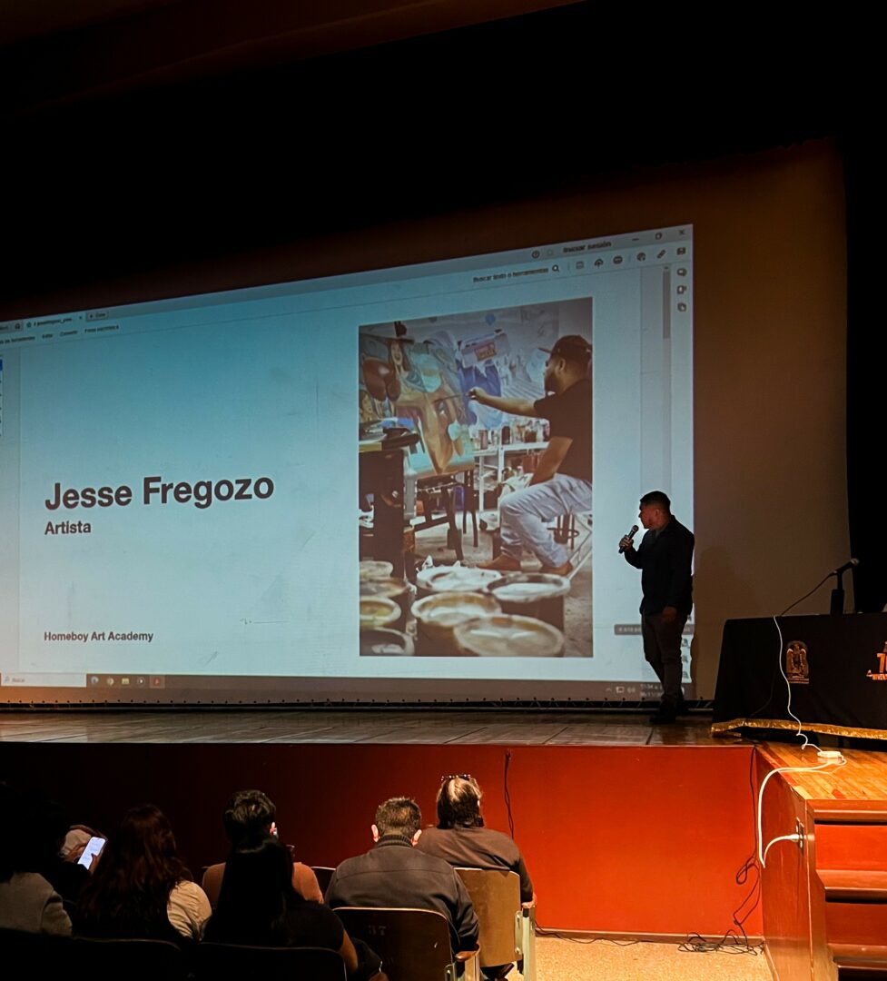generation after generation. Fregozo straddles the line between design and pop culture in the development of his work. His intense works on canvas, paper, photography, and design are mediums for the development of his artwork. Fregozo is currently a teaching artist at the Homeboy Art Academy. This past fall he painted a mural titled Community is Life at White Memorial Community Wellness Center in the city of Montebello. Fregozo was also invited to Mexico City by Chicano sin Fronteras to represent the Homeboy Art Academy and was part of various artist panels in high end institutions around the city like UNAM and La Esmeralda. He was part of