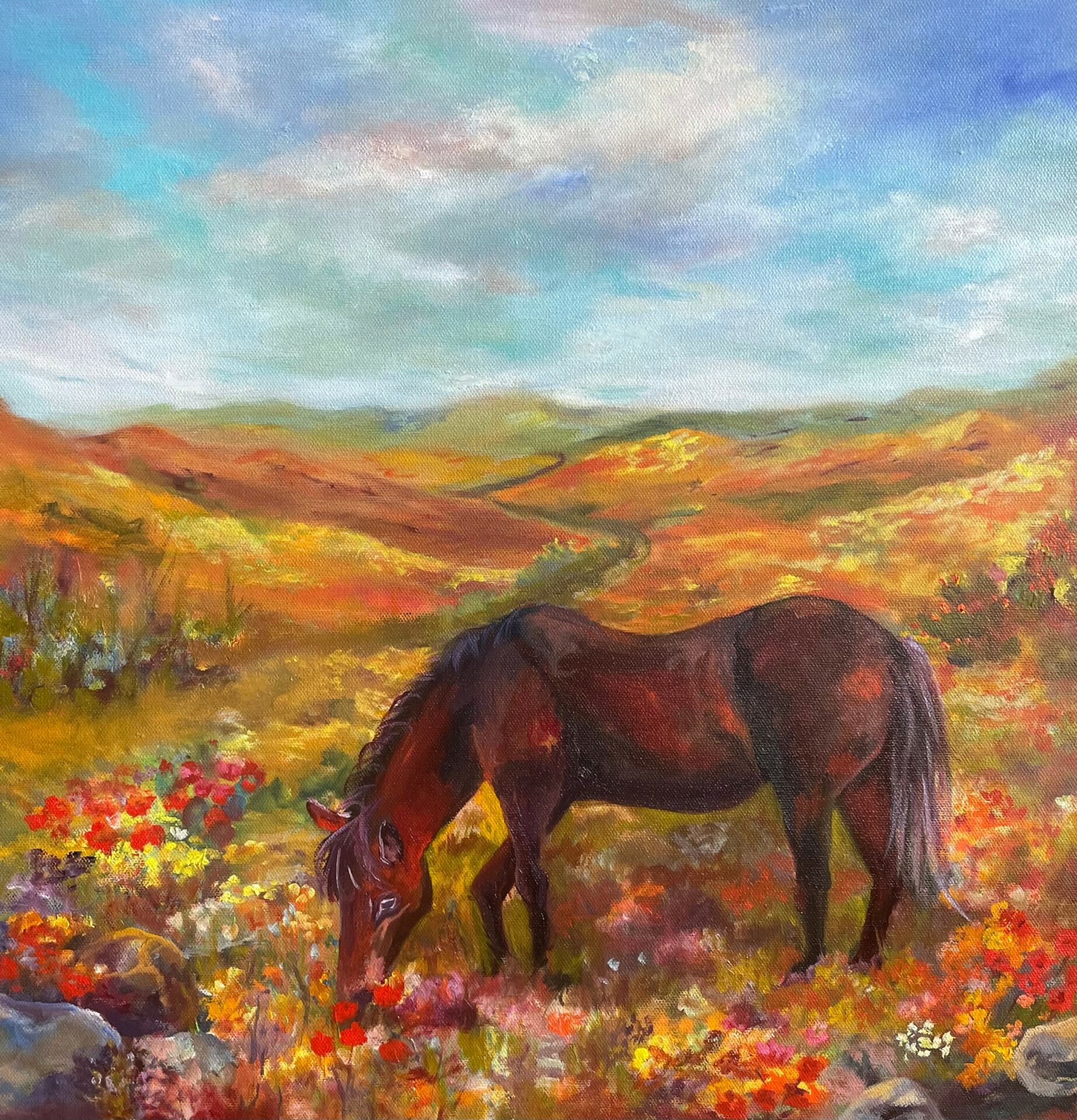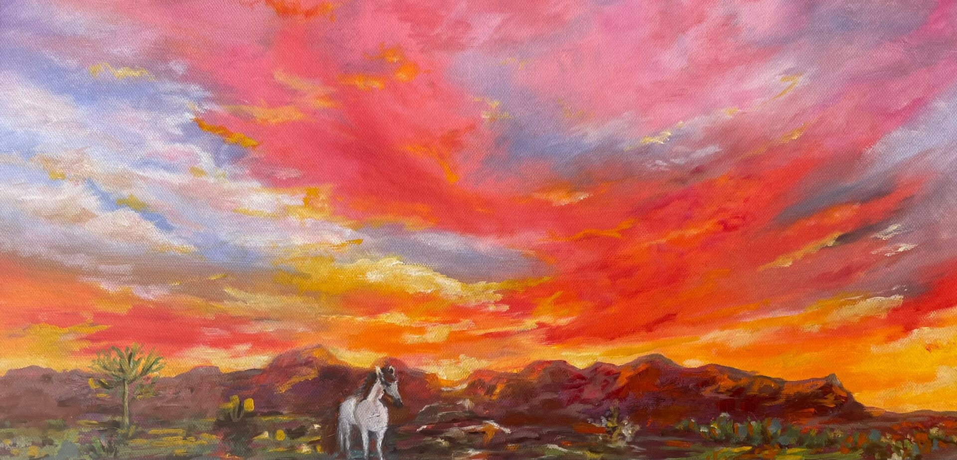 This past year I started a series of oil paintings of the majestic wild horses. I have painted them enjoying the beautiful super bloom that we experienced last spring. I have also painted them enjoying the lower Salt River. While I am still adding to my wild horse collection, I have also been painting the incredible mountains and skies.