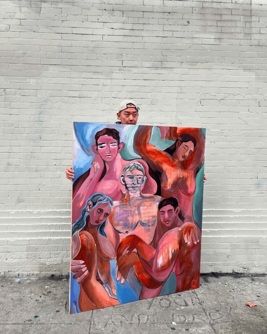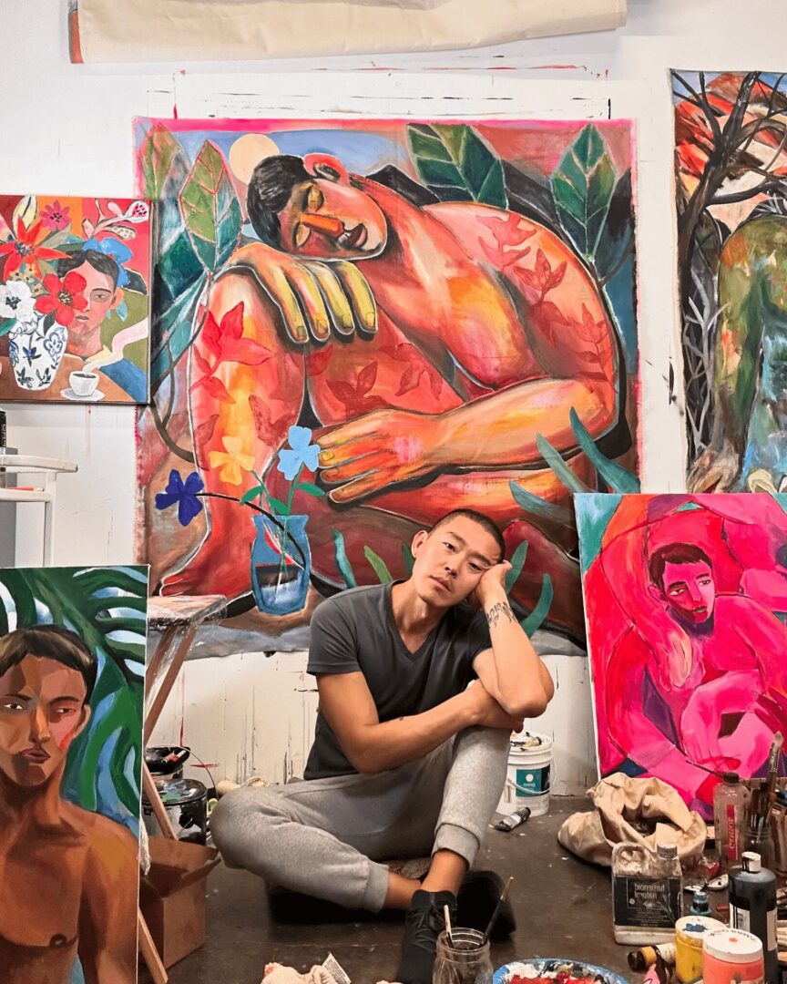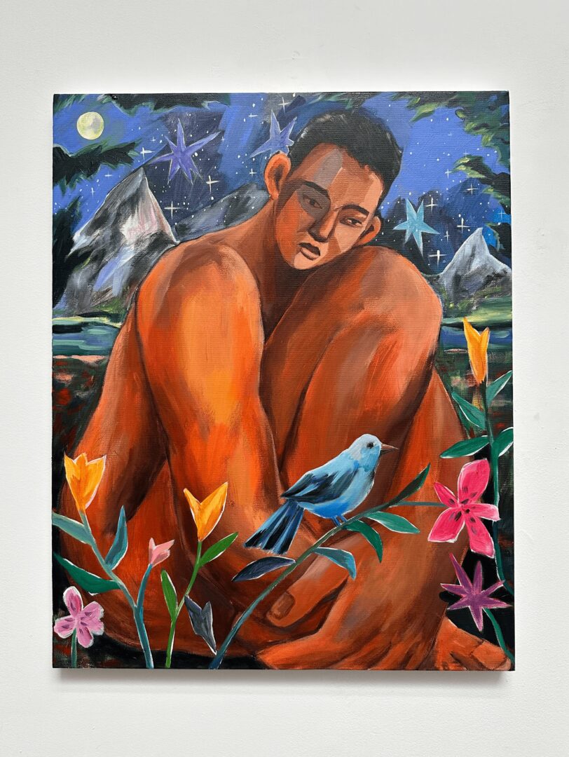 I’m primarily a painter, working with acrylics and oils on canvas or paper. I’m drawn to large-scale works where my figures celebrate life, inspired by personal experiences and my chosen family. My art explores the concept of evolving identity, drawing from the real-life journeys of immigrant and Queer experiences. I love depicting my figures confidently moving their bodies or peacefully resting in natural settings, to capture their true authenticity.