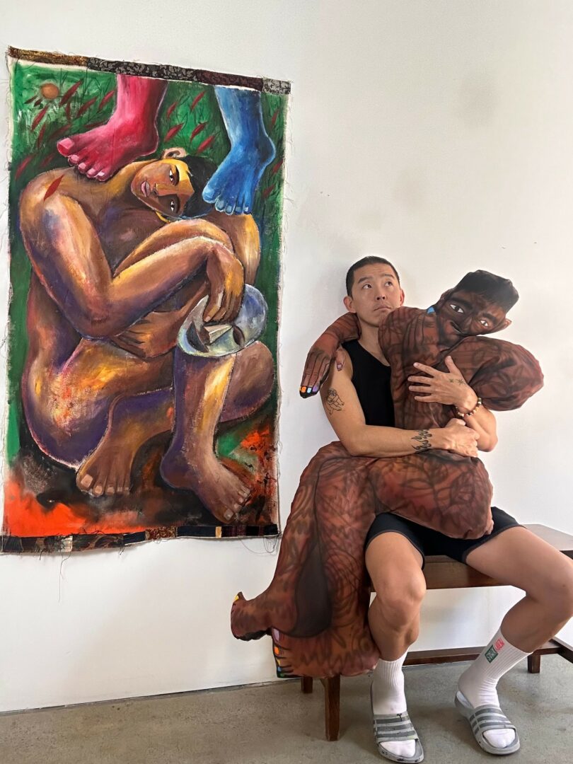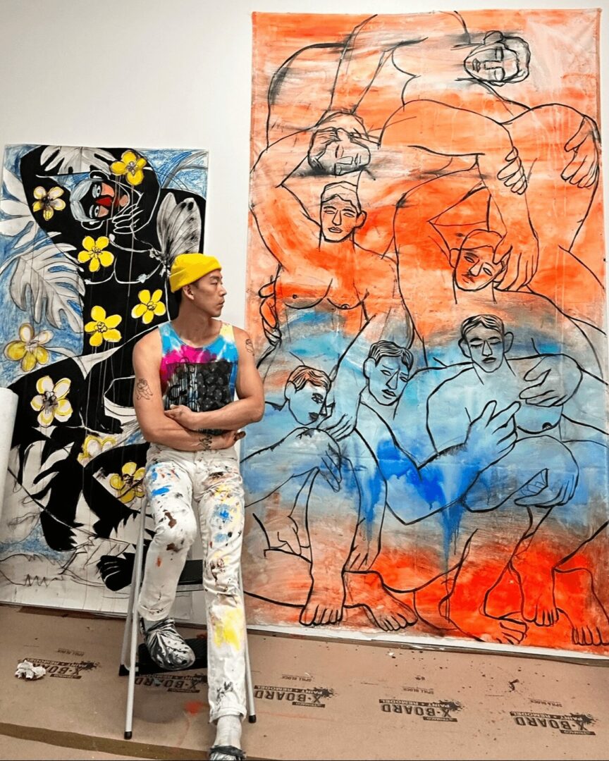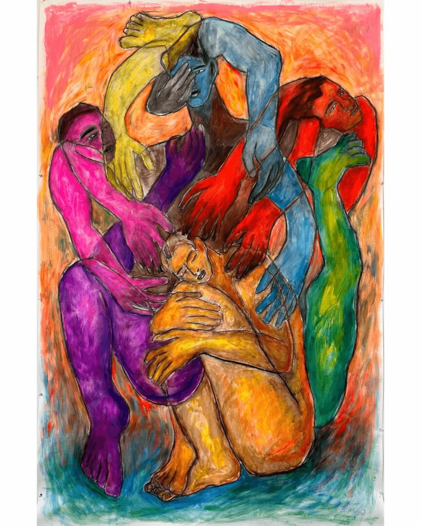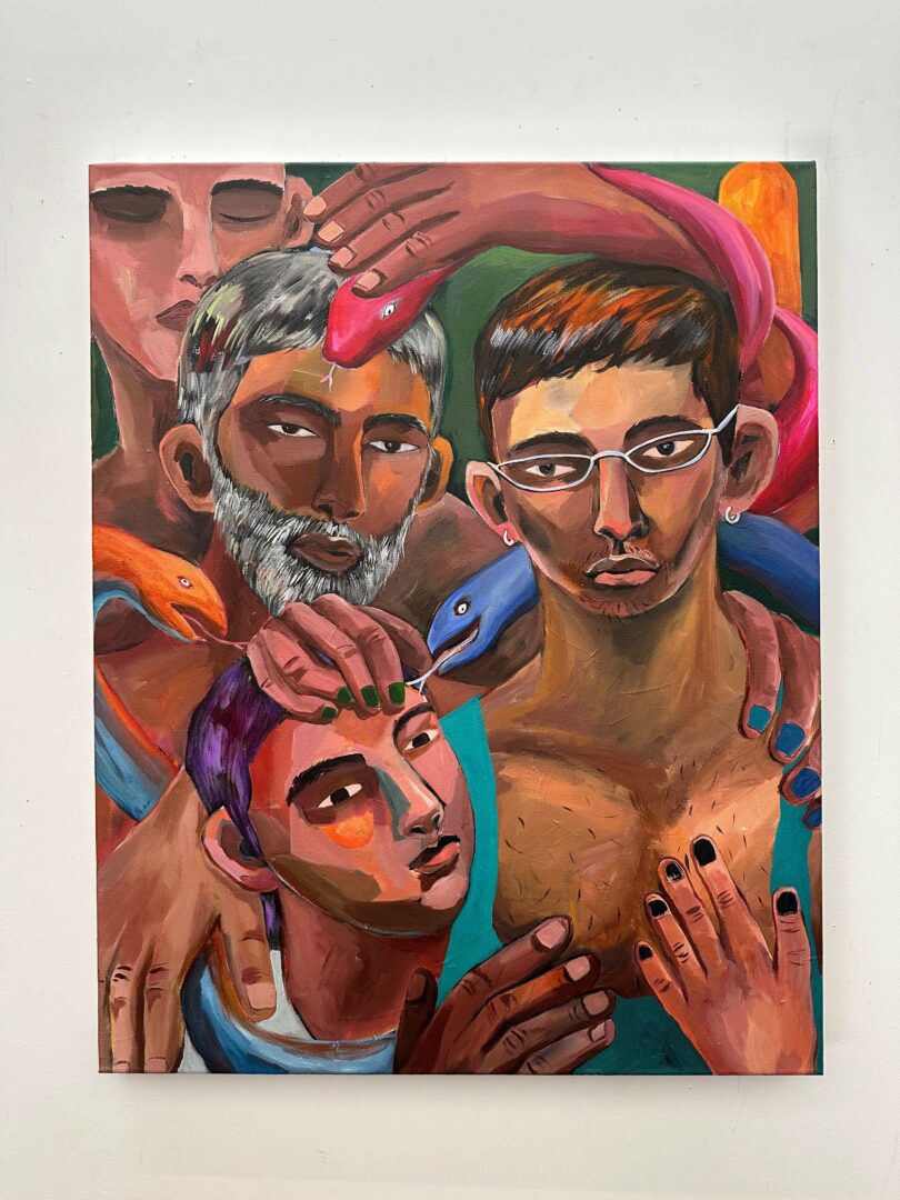 I’m primarily a painter, working with acrylics and oils on canvas or paper. I’m drawn to large-scale works where my figures celebrate life, inspired by personal experiences and my chosen family. My art explores the concept of evolving identity, drawing from the real-life journeys of immigrant and Queer experiences. I love depicting my figures confidently moving their bodies or peacefully resting in natural settings, to capture their true authenticity.