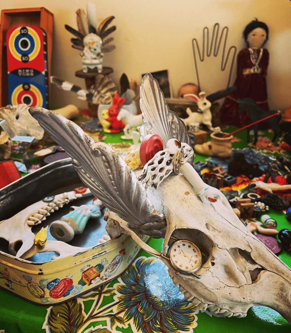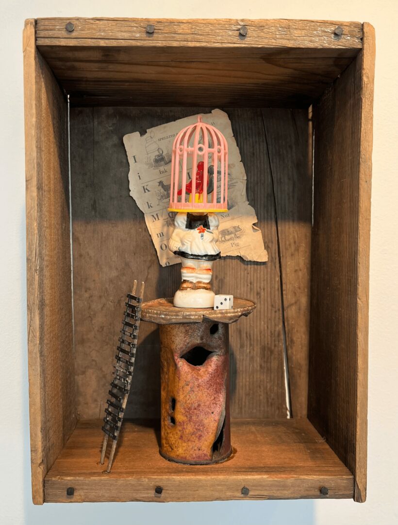 Since relocating to California’s high desert after a long career as an advertising writer, I’ve been fortunate to be able to devote my time to creating found-object assemblages. The Joshua Tree area has a vibrant, very eclectic arts community–and I’ve flourished creatively with the inspiration of its natural beauty, rich history and spirituality, as well as taken on roles with non-profits in gallery management, fundraising and more.