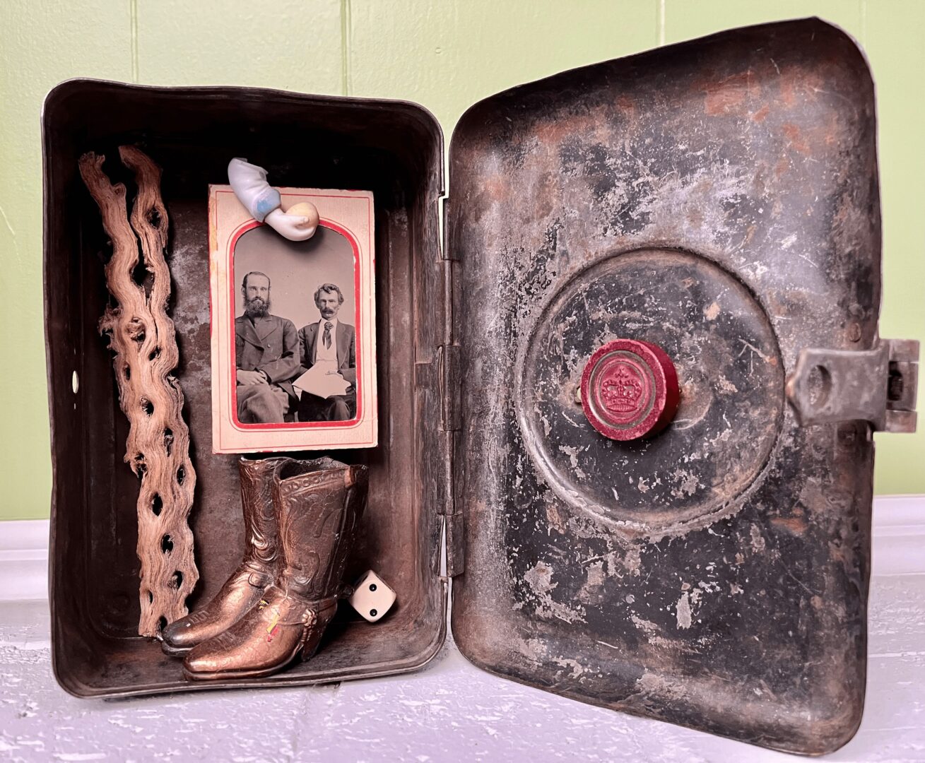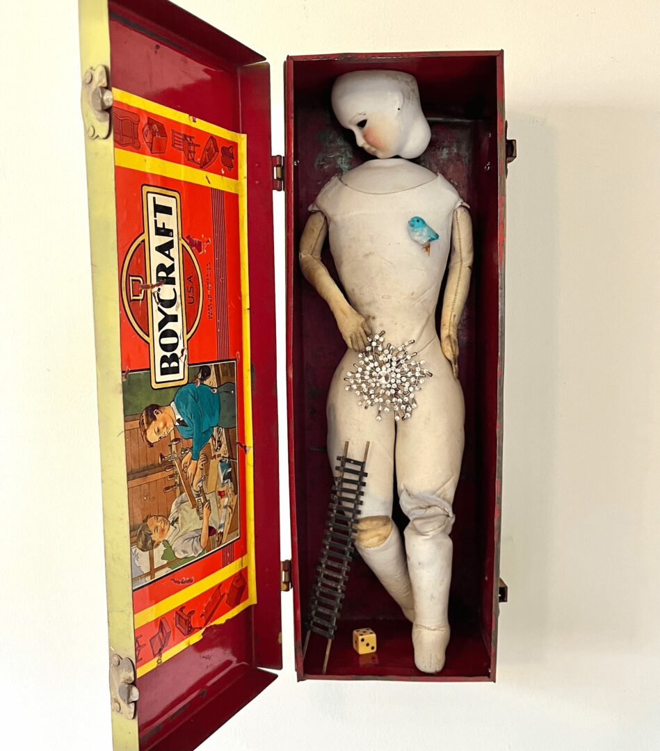 My work (which a fellow artist kindly deemed “poetry in a box”) veers toward the lyrical, provocative, sometimes playful. Arcane figures, stones masquerading as hearts or clouds, evocative tintypes, rusted hardware and bits of wire, totems of luck…they show me where they want to go in each piece, creating their own tale of mystery and wonder.