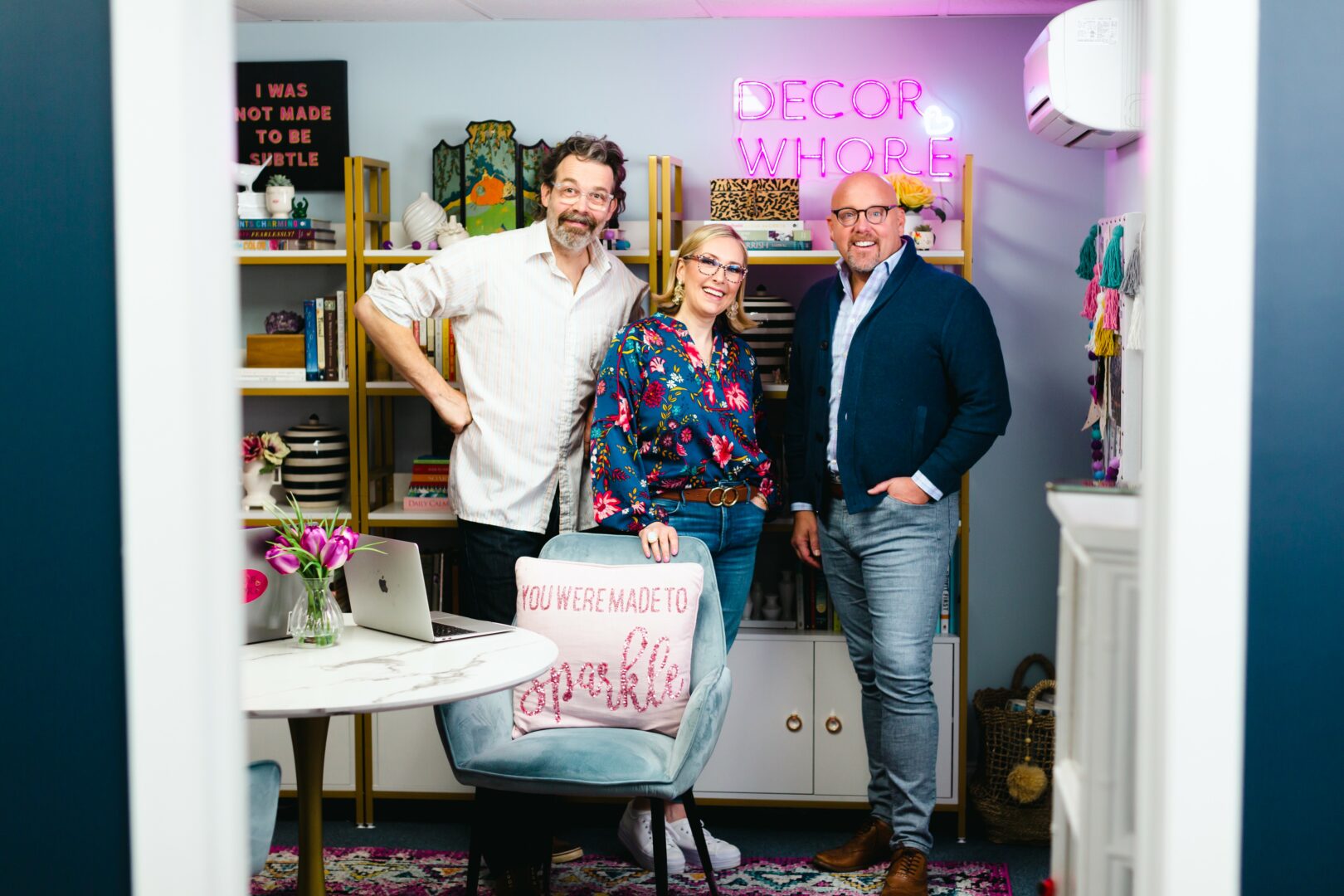 That night, a friend pulled me aside and asked if she could hire me to decorate her office. I said yes (because duh, I was looking for income from ANYWHERE… well, almost anywhere)… and it ended up changing everything. I poured myself into that office makeover, posted the before and after pics on Facebook, and suddenly… BOOM… my inbox blew up. People were obsessed. That one job turned into another… and another… and before I knew it, I had a business. I just had to name it something that felt like me: a little irreverent, a lot of fun, and totally unapologetic. And thus, Decor Whore was born.