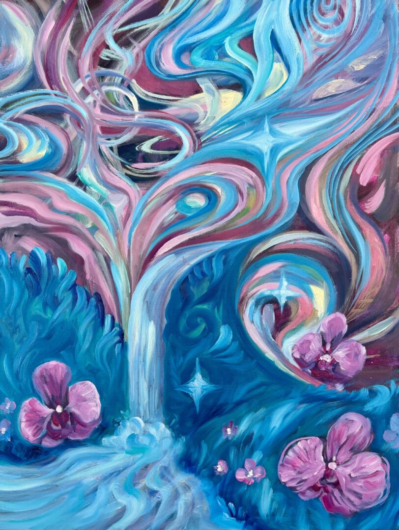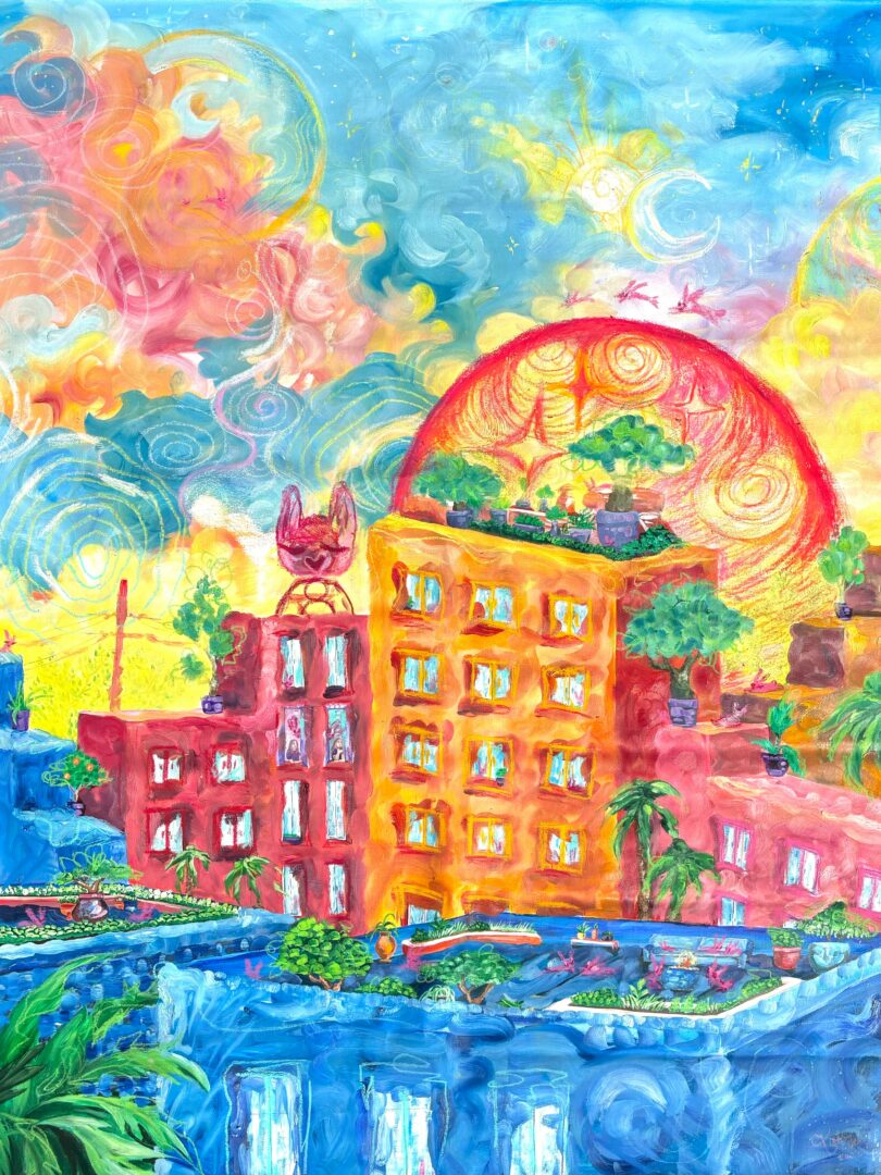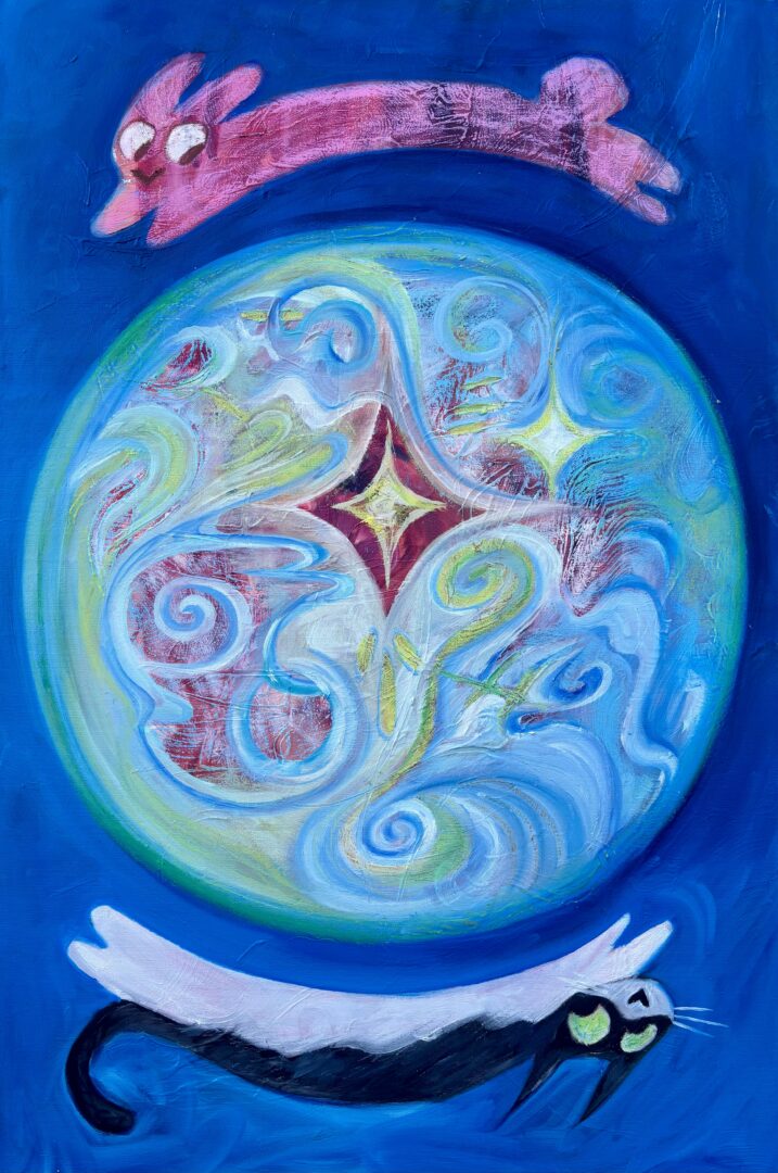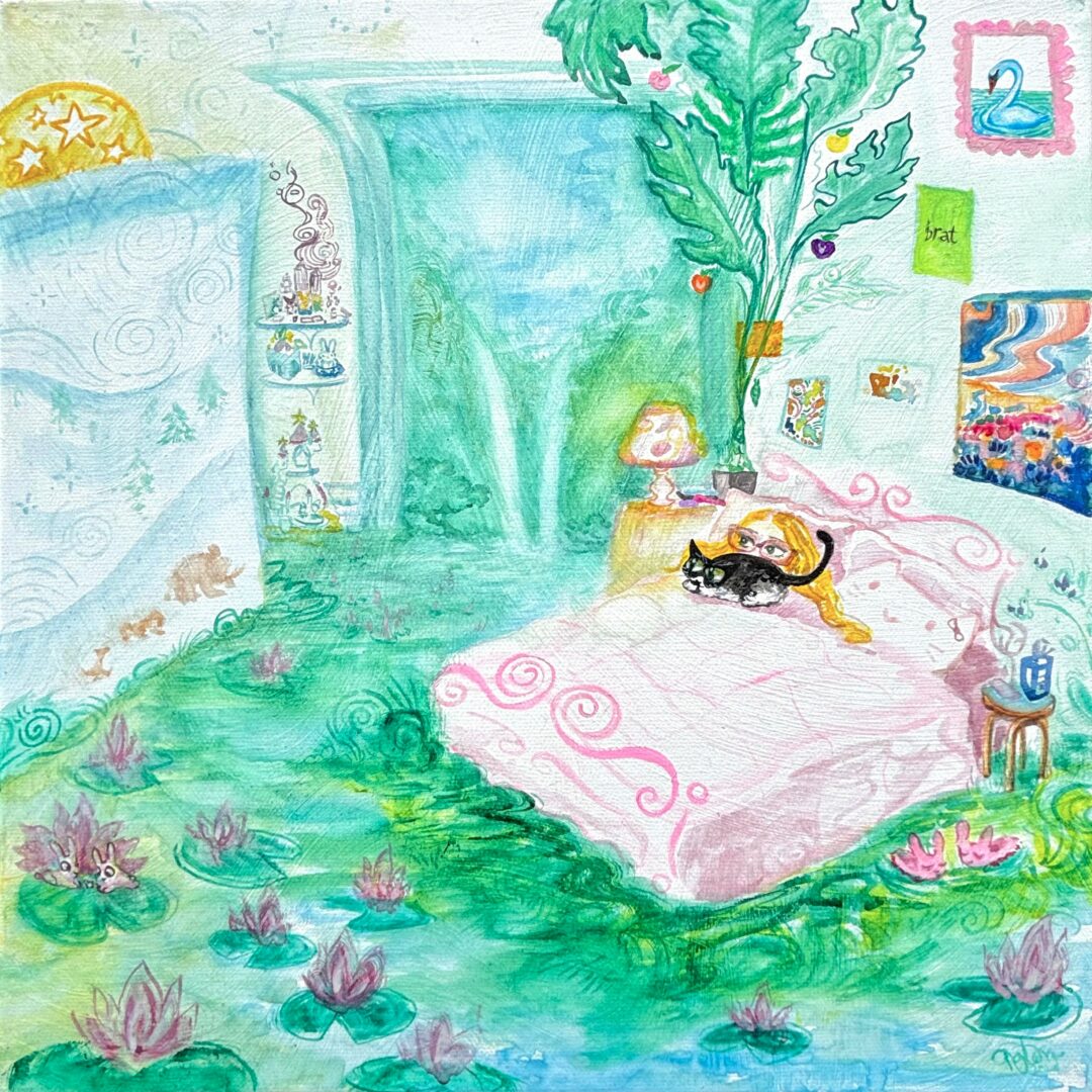 I exhibit my paintings in art exhibitions and sell art prints of my work. I recently had a solo show called “Planet Bunny” with a pop up print shop. For 2026, I would like to do many more in person events. I have had three solo shows all with very similar themes of play and color as psychological processing which absolves into otherworldly spaces, commonly inhabited by pink bunnies who are curious and brave.