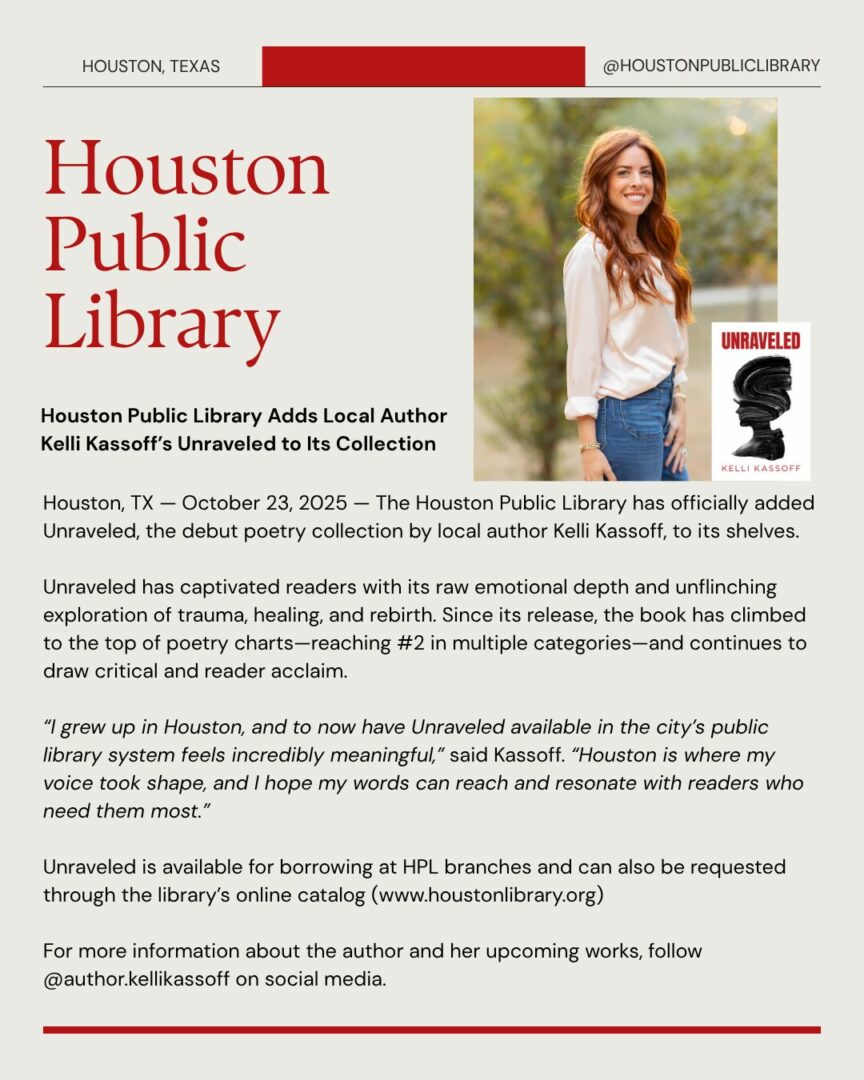 Right now, I’m working on my second book “I Spy A Water Tower”, a collection of emotionally charged nonfiction short stories, and continuing to share my work through readings and events around Texas. In the near term, I have a local book tour to various local book stores, and I am being featured as an author at the Texas Book Festival in November. Recently, I was informed that my book (which recently won two awards and hit the Amazon Bestsellers List) is being sold in London, so I might try to pop over there for an event. Also HUGE for me since I grew up checking out books at the HPL, Unraveled has been added to the Houston Public Library System. I am excited to make my work available to all readers. All of my upcoming events can be found on my Instagram page @author.kellikassoff