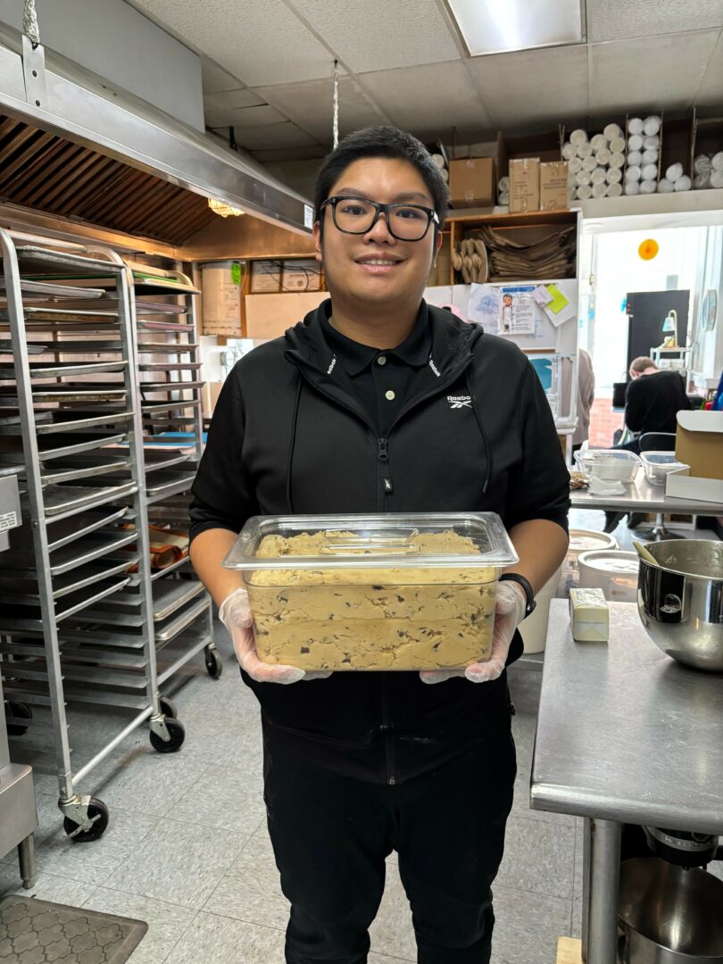 Both Carson’s Cookie Dough and Just a Taste of NJ are set up with accommodations to allow those working in our shop or kitchen to thrive. This may include printed instructions for how to complete a task, a picture diagram reminding workers of the dress code required by the health department, instructions on how to properly wash hands, different seating options, and a wide variety of broken down tasks, ensuring there is an opportunity for everyone – regardless of their ability – to succeed. This is the aspect that I am most passionate about. It is extremely rewarding to watch the adults who come into our kitchen week over week. I love to see their confidence grow as they master the different tasks. They may start with something simple, like labeling packaging, and then we move them up to weighing ingredients, then to working the mixer, and so on. There is nothing like seeing how proud they are of themselves – and they should be proud, they work extremely hard.