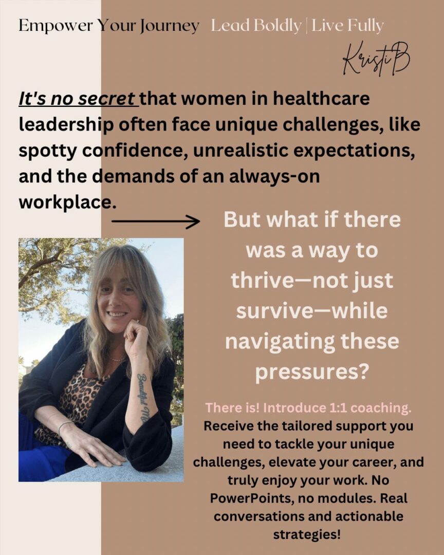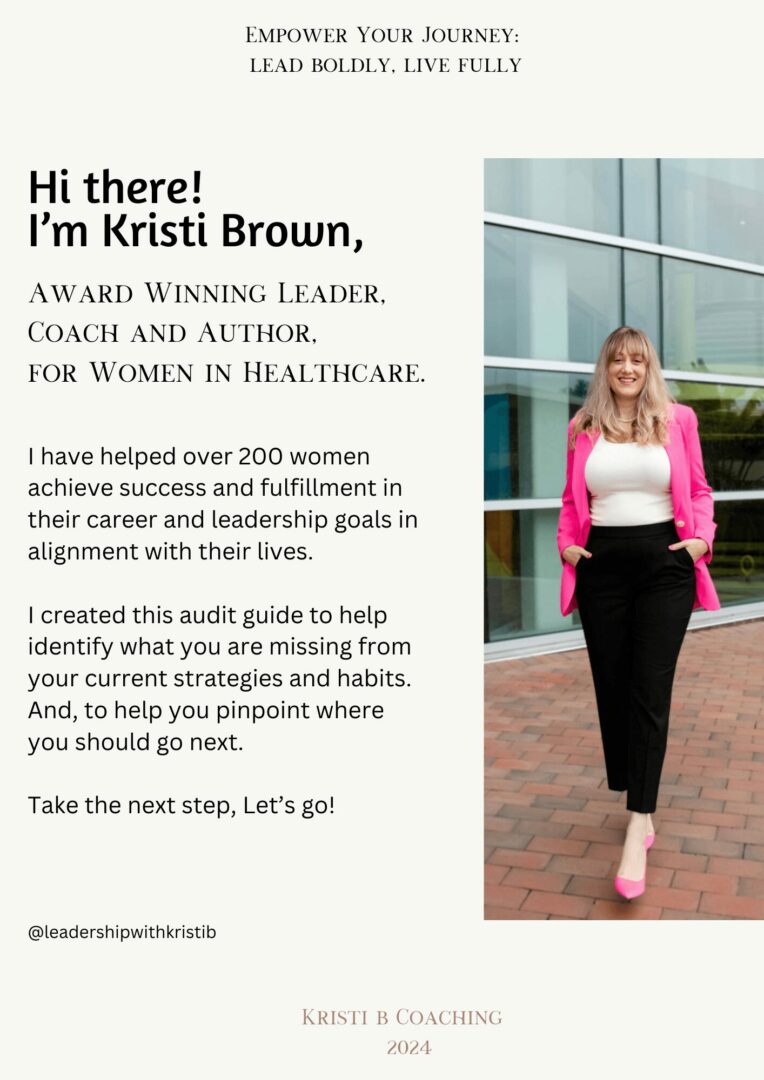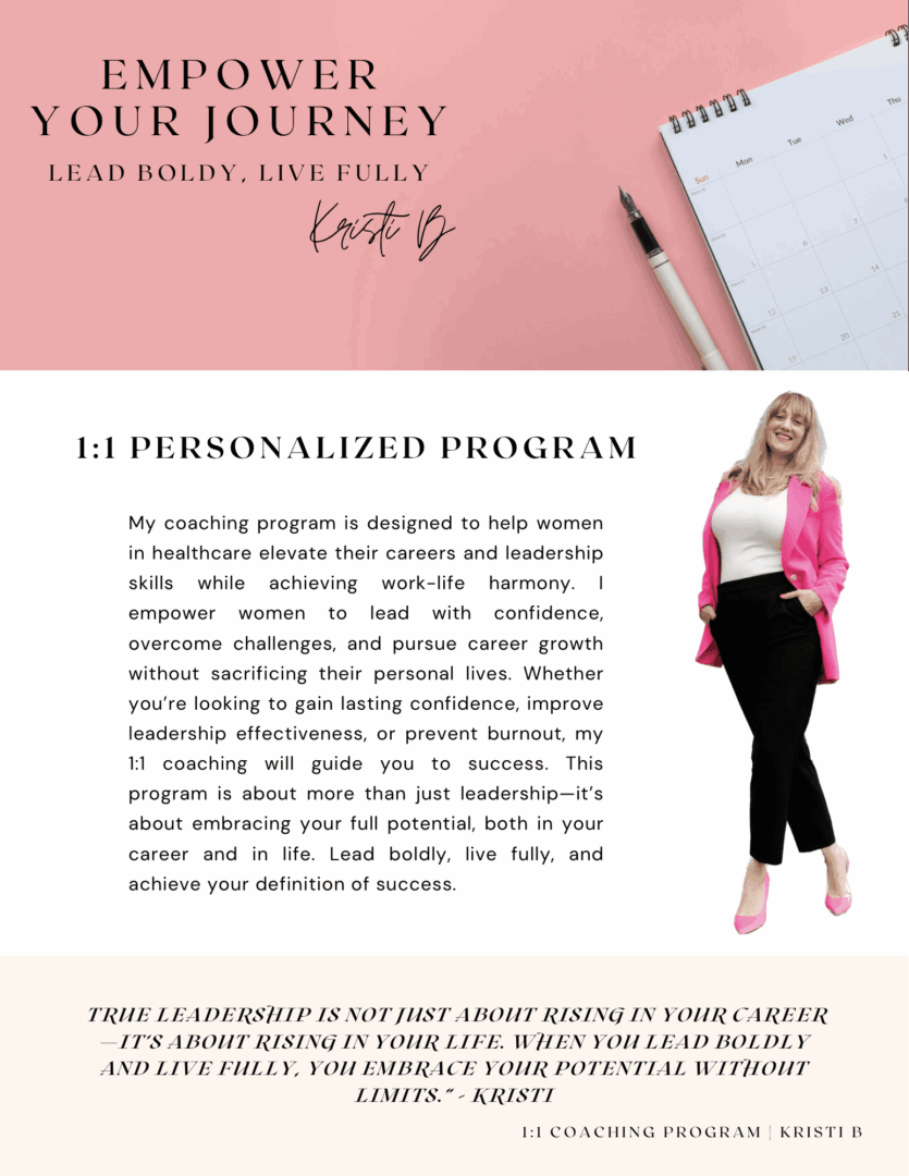As a Leadership and Career Development Coach, Kristi is deeply passionate about empowering women in various healthcare roles to unlock their full potential. She understands the unique challenges women face in demanding industries and is committed to helping them develop the confidence, leadership skills, and work-life health needed to thrive—both personally and professionally. Kristi’s journey was shaped by overcoming perfectionism, self-doubt, and societal expectations, which now fuels her work to help other women break free from self-limiting beliefs and lead with authenticity and purpose.