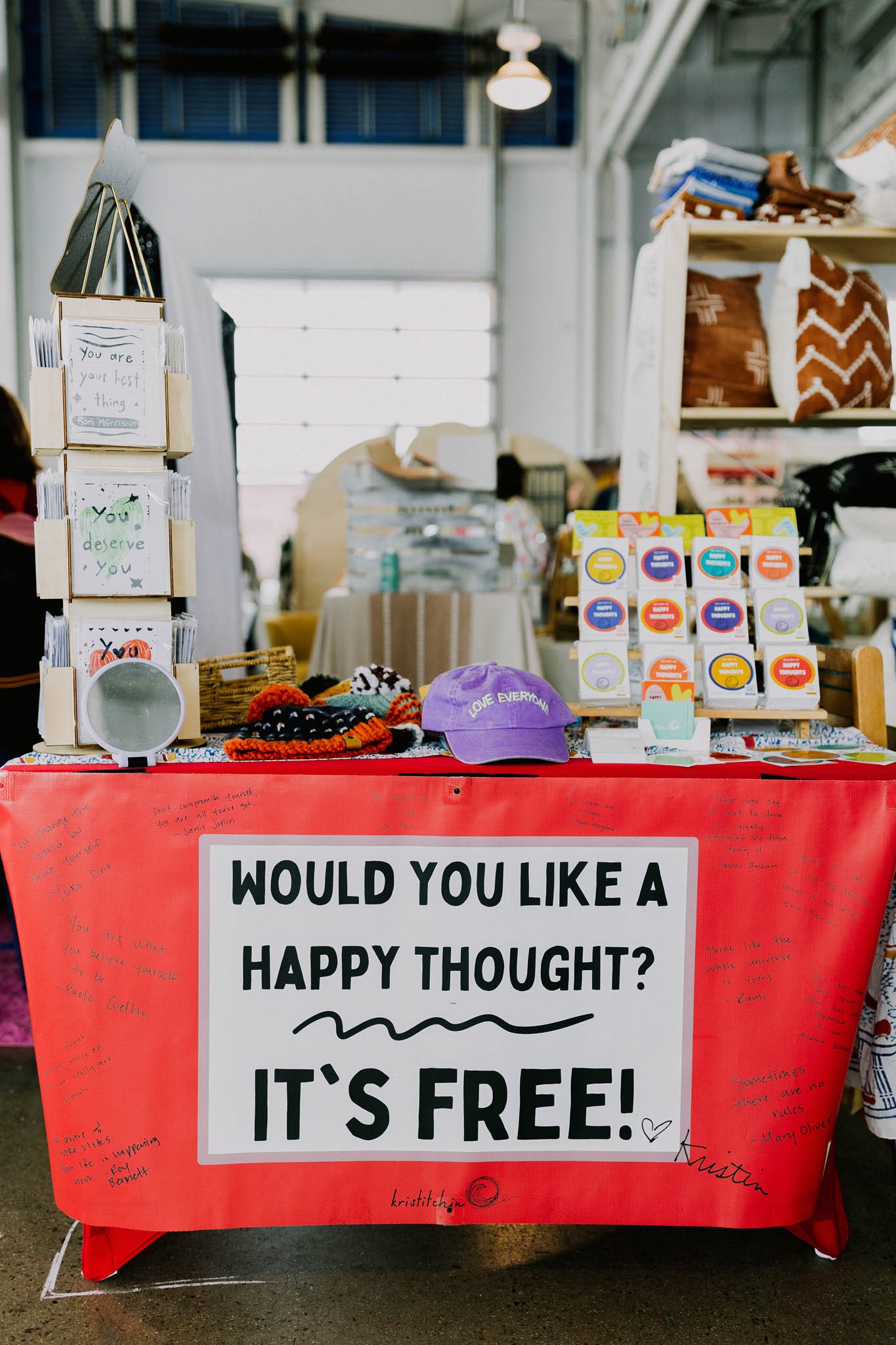 Hmm what do I do… it is shifting all the time, so I think what I do right now is dream big. I started a business back in August of ’21 and didn’t know what I was selling. While figuring it out, I brought handwritten Happy Thoughts with me wherever I’d sell. Happy Thoughts are thoughts I’ve been writing down for a over a decade to help me feel ok being me. It was an utter shock when handing out these Happy Thoughts turned into the business themselves.