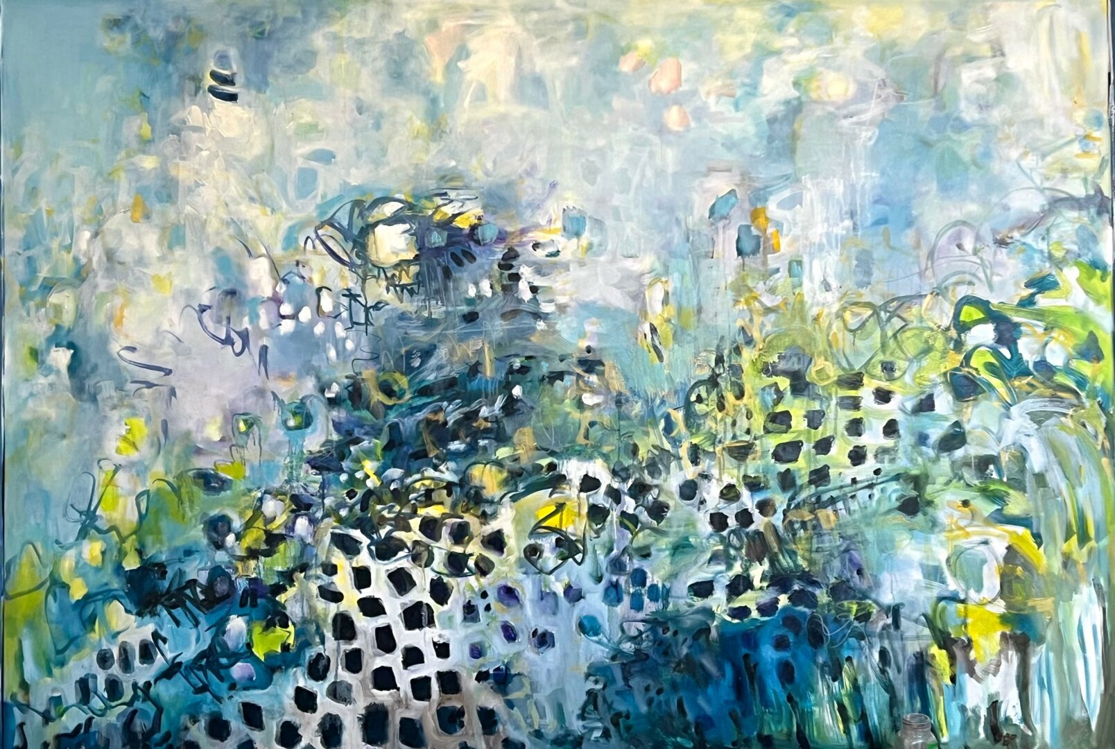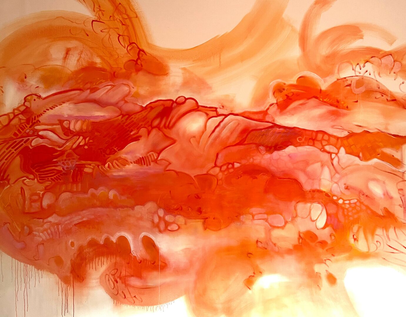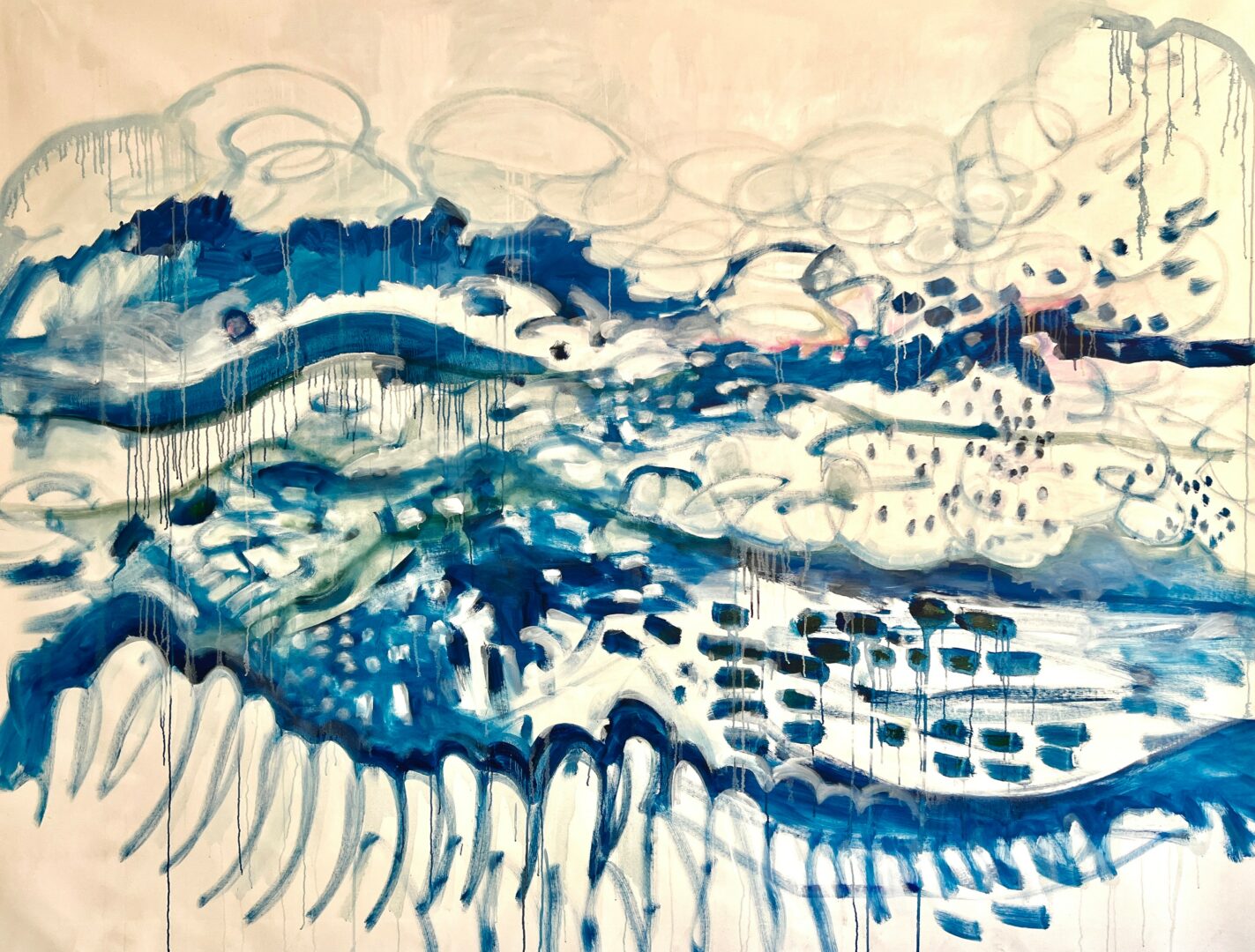 Since 2020, the majority of my time has been spent collaborating with interior designers and decorators in the gulf coast region of Florida. I enjoy the physical challenge of working on sizeable commissions, often somewhere between 6’x 8’ to 8’x10’ paintings. Using my whole body can sometimes be exhausting, but I believe the works have a special authenticity when created in this fashion. The larger I can paint, the more spontaneous, loose and real the images seem to be. And even when I go to galleries or museums to view paintings, my favorite ones are the biggest ones. Working that large gives me a sense or feeling of “being in the painting,” like almost it’s possible to physically exist in the spaces I paint. There’s just something so rewarding about the process, I just love it so much. And when I can use this creativity to make something custom for a client – not only using their preferred color palettes, but also bringing in their own personal themes and metaphors into the artwork, I feel I’m truly living my purpose.