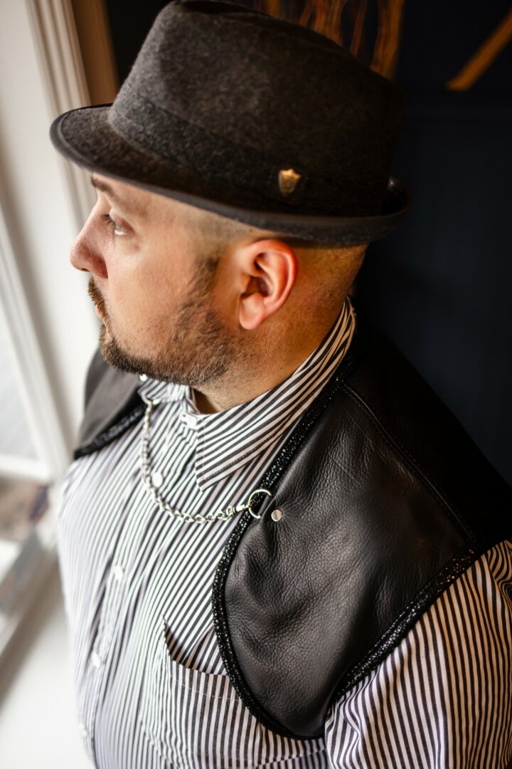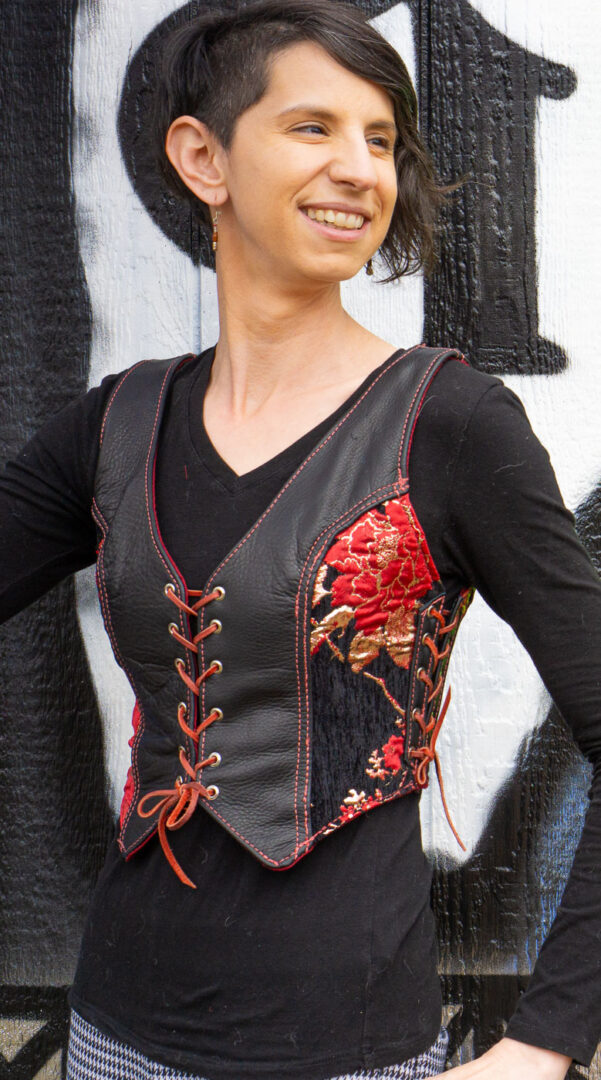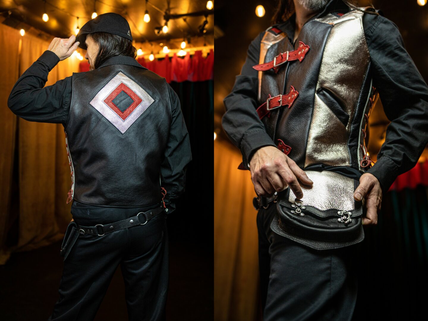 Tailored clothing, especially leather, has a certain fit. When it’s right, it is like a second skin. Often people walk into my shop or booth and don’t expect to find something for their body, and if it isn’t there I welcome the opportunity to create it! Resizing and on rare occasions, redesigning an existing piece to fit a particular human is a challenge that feeds my need to create and get a small taste of the larger experimentation puzzles I crave in designing.