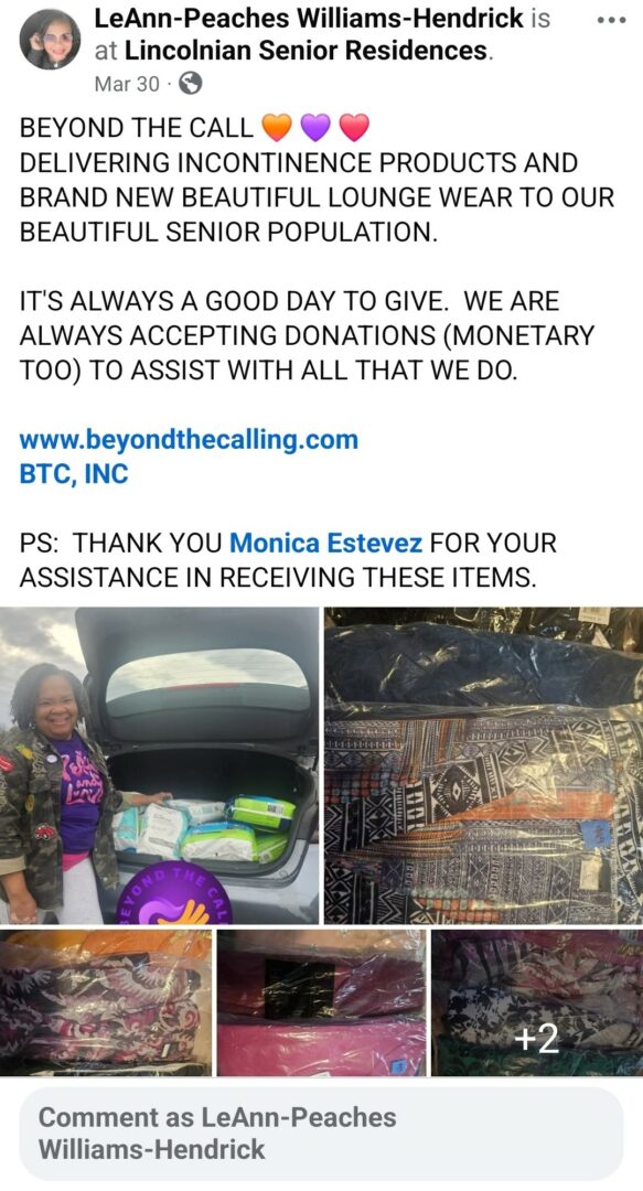 LeAnn assists the unhoused community, returning citizens, victims of domestic violence as well as individuals in need by providing essential items necessary for them to make it day by day. LeAnn also assists those who face food insecurities including but not limited to clothing, toiletries, school supplies, home cooked meals, etc.. Just this past year Beyond The Call distributed over 5,000 meals which consisted of sandwiches, beverages, snacks, and even hot dinners. During this past holiday season Beyond The Call distributed over 200 toys to children who otherwise wouldn’t have had anything on Christmas day. In addition to the children being blessed, every mother of a child received one of Beyond The Call’s Signature Smile Bags too. Beyond The Call has partnered with several domestic violence shelters to provide essentials. Beyond The Call has helped furnish several transitional homes. Every week LeAnn distributes 200lbs clothing to individuals in need and has partnered with other organizations to provide clothing, shoes, and other essential items as well.