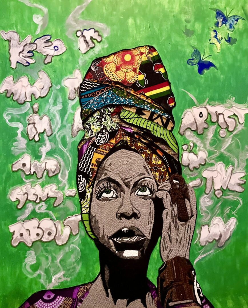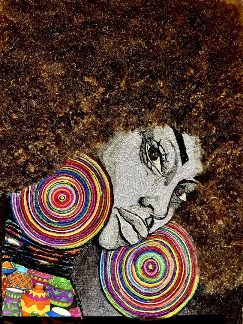 My artistic career has significantly advanced due to the activist inspiration provided by my brother, Shambo. As an artist, singer, mentor, and a prominent figure within the Black community, Shambo has amplified the impact of my work. Through his guidance, I have learned to honor my heritage through ancestor veneration and to champion the rights and freedoms of all people. He has instilled in me the ability to connect with profound messages aligned with my purpose, while embracing, celebrating, and advocating for my identity. Recently, I collaborated with Shambo on the video “Babylon,” which exposed the horrors of racism, fascism, capitalist genocide, and war. In this piece, I portrayed a woman coerced into an abortion. To embody the role authentically, I delved into difficult emotions and strived to comprehend the woman’s anguish. His unwavering support and encouragement have enabled me to approach each creative decision—from stitches and brushstrokes to image selection—with a heightened awareness of how I want my art to resonate with audiences.