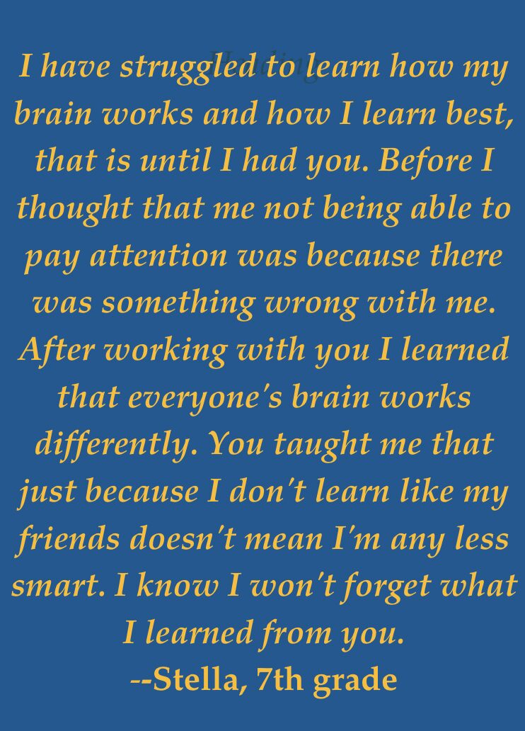 Typically, their parents have explored various options and interventions but are still puzzled about why certain aspects of school are difficult for their child. My goal is to work with these students to identify their unique learning styles and develop the tools and confidence they need to succeed academically and personally, including the organization and time management skills essential for navigating their educational journey.