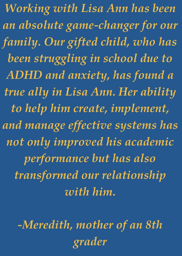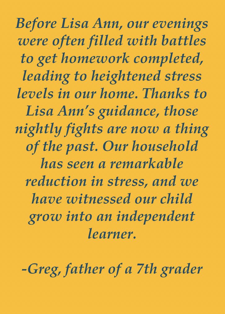 My ideal client is an upper elementary or middle school student who is struggling in school, but the reasons behind their challenges aren’t always clear. These students don’t just need a tutor for specific subjects; they require support in becoming confident, independent learners. Often, they need help establishing effective organization and time management skills to complete tasks, but they may not know how to implement these strategies on their own.