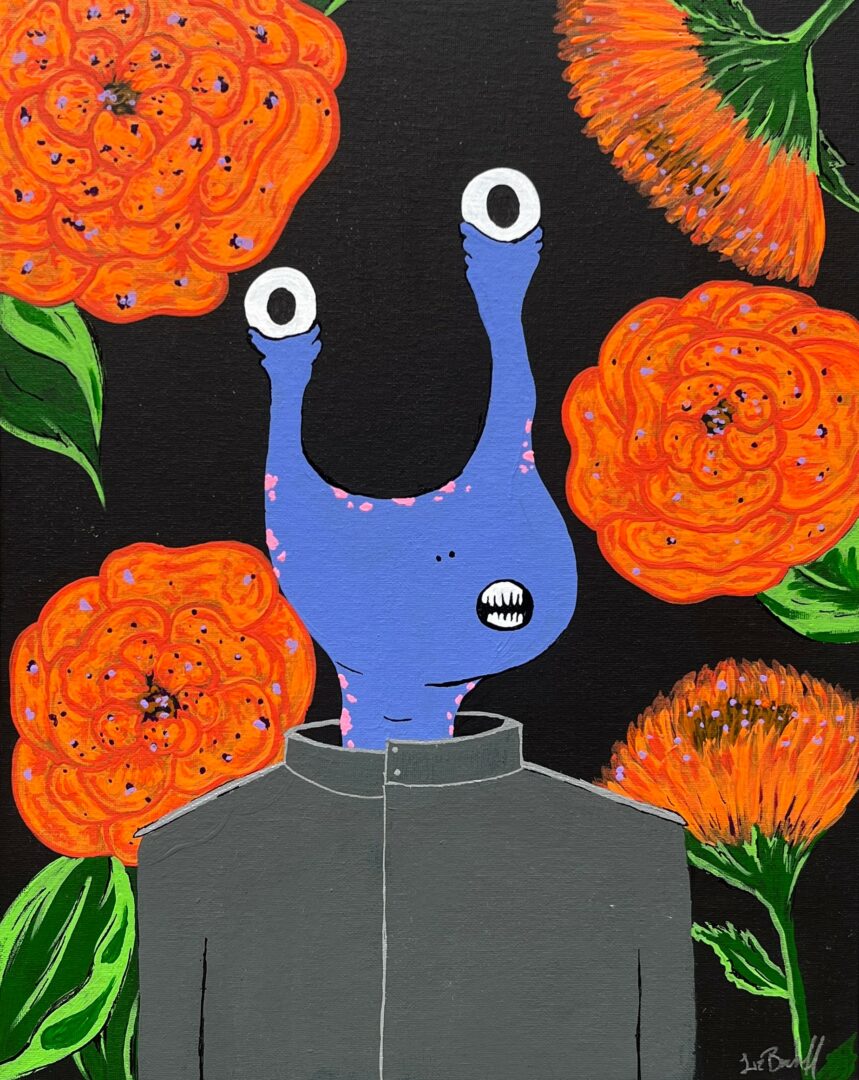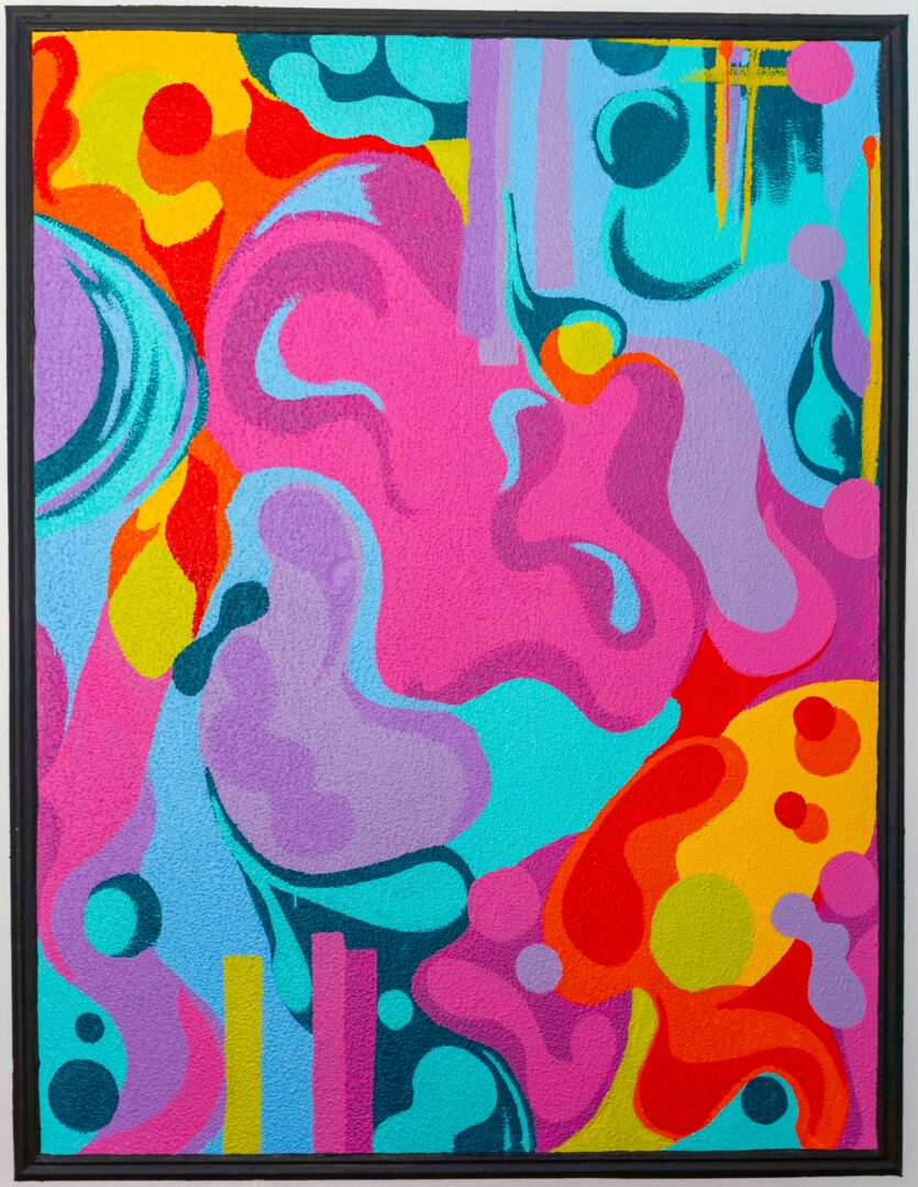 My visual art is bold and colorful, blending pop art with psychedelic and intergalactic themes. You can see one of my floral murals on the stage at Unruly Collective. I also participate in art shows, create stickers, prints, and take custom fine art commissions. I love working with others to bring unusual or personal ideas to life.