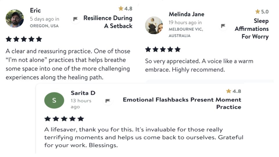 You can find me on Insight Timer (16.4k followers) where I am on live several days a week guiding meditations and nervous system practices, including a Friday Night Dance Party followed by an hour long meditation. I have hundreds of guided practices and meditations as well as audio courses on topics such as Friends With Your Mind: How To Stop Torturing Yourself With Your Thoughts.