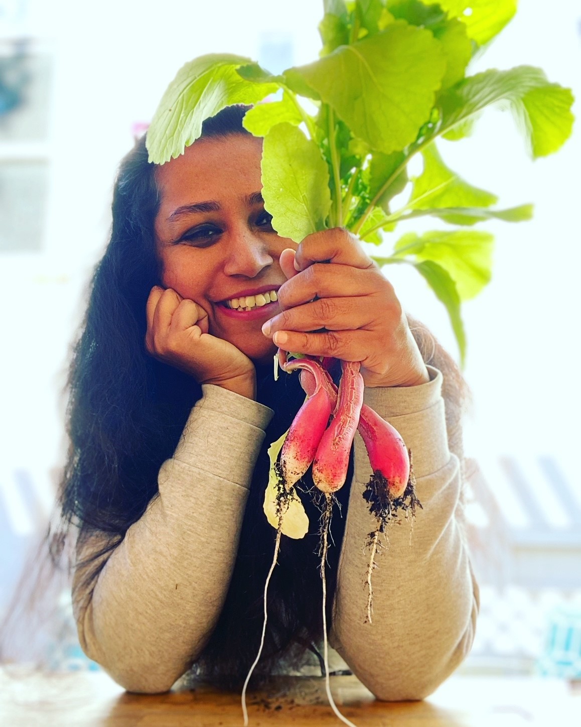 I have two lives that I manage almost in parallel–that of work in strategy at a global diagnostics company focusing on cancer diagnostics. The other life is that of an author and cook–I work closely with San Diego urban farmers at a community farm, using their produce to recreate foods from my native country. New Roots Community Garden is a farm run exclusively by refugees and immigrants from all over the world, primarily women who support their families through food they grow. I–the daughter of refugees and an immigrant myself–love to support them but in turn, cook food from my land (Bengal) using their produce which is the basis of my food narrative memoir, Khabaar: An Immigrant Journey of Food, Memory and Family (2022) which highlights my own story as an Indian graduate student in America, and how food represents our lives we left behind when we as South Asians migrated or immigrated. I also am a TEDx speaker on immigration, talking about how food travels through migration, immigration or indenture–it’s titled “What Do We Talk About When We Talk About Food?” I think food, especially when we are speaking/interacting with strangers/new folks, connects or at the very least, starts a conversation. I love to gather people to have a conversation on social justice, our connections, immigration and what food as a memory means to us–through monthly supper clubs I host in my own space.