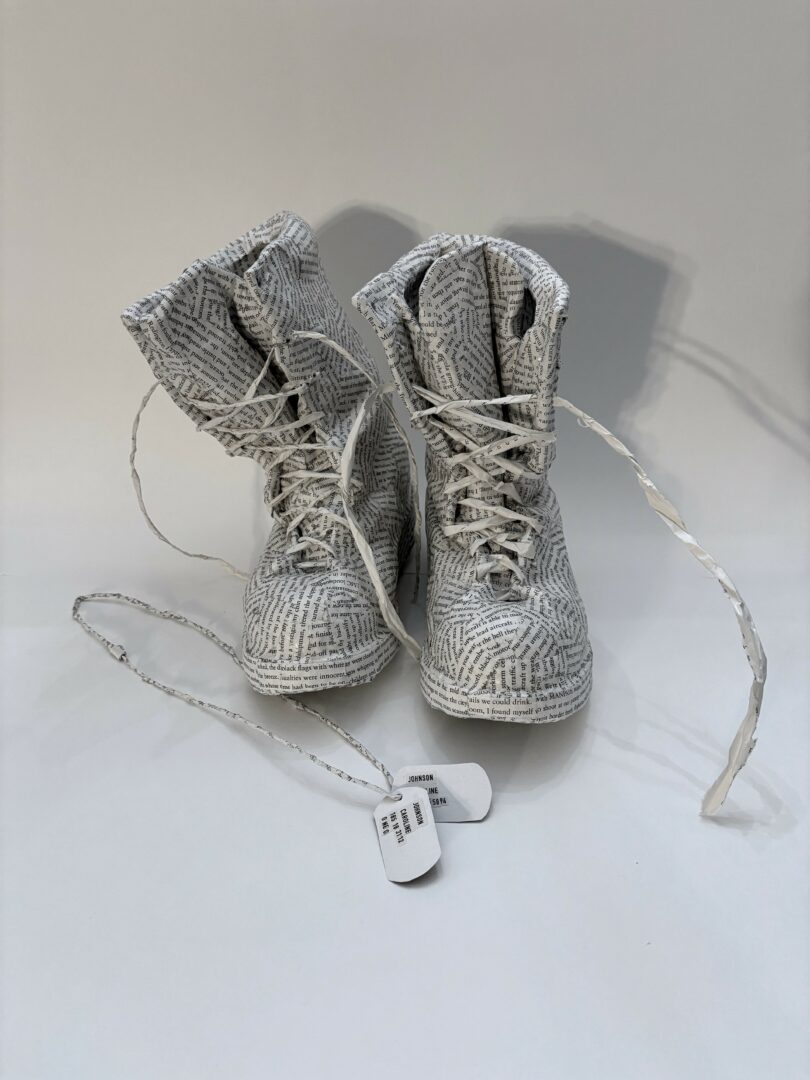 I work by hand, cutting, folding, tearing, gluing or using any other necessary process to reveal the artwork that the book needs to become. I’m currently in a series of paper-casting women’s shoes and highlighting books about strong women.