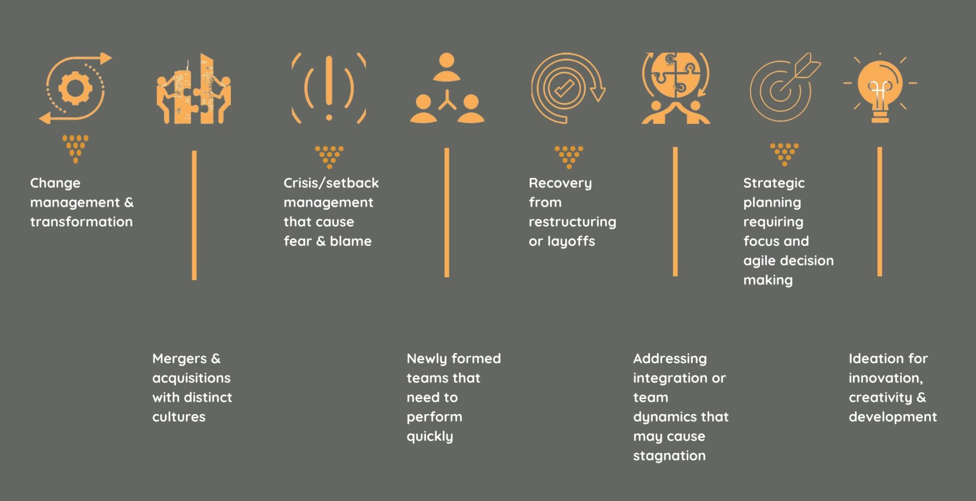We have found our ideal client is the director/C-suite that knows they need to get a result for their team, organization, and even themselves. This pertains to bringing teams together, dealing with organizational changes for various reasons, and even ongoing strategy sessions. The qualities that really work are an open curiosity, an interest in trying something new with a high-touch, and of course, humility and a sense of humor is a bonus. As we like to always say, we take our job and mission seriously, but not ourselves. If that resonates with a client, too, it’s a perfect match.