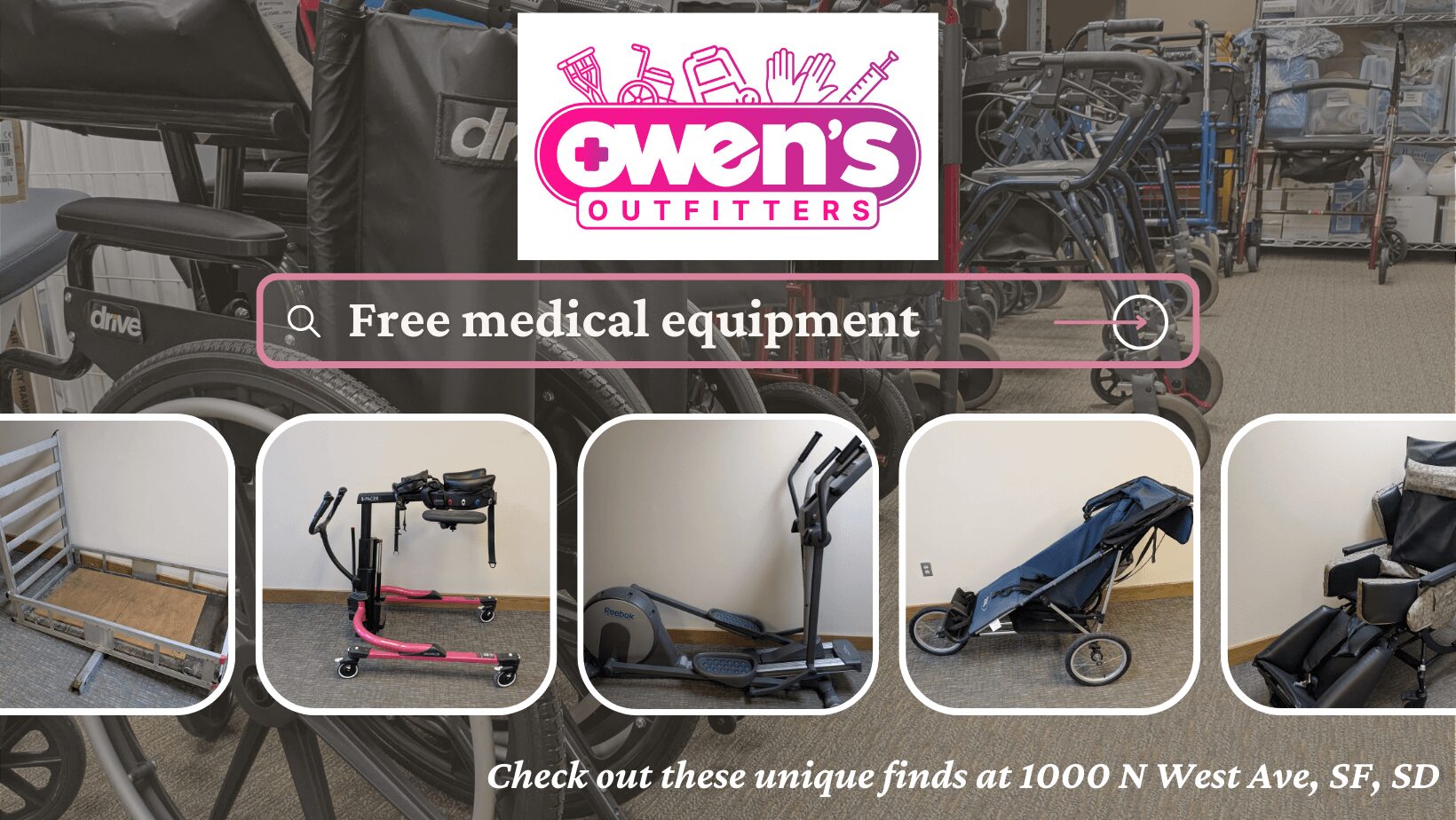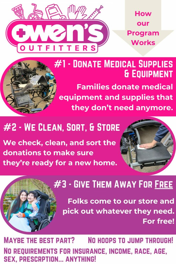 Owen’s Outfitters is a medical equipment library. Our mission is to provide durable and disposable medical equipment at no charge to those who need it most, sourced through community donations. Essentially, we take donations of almost every kind of medical supply or equipment ranging from diapers and syringes to large items like hospital beds and electric wheelchairs. We then give them away to anyone in need regardless of insurance, income, race, age, sex, or location.