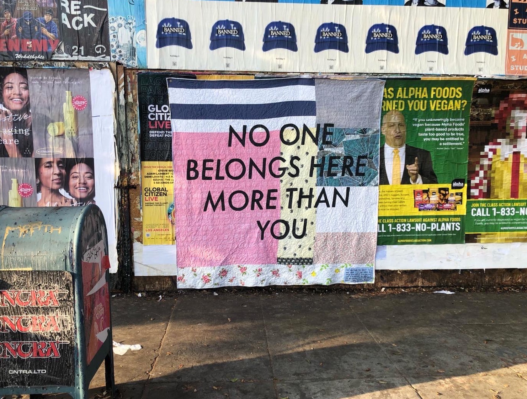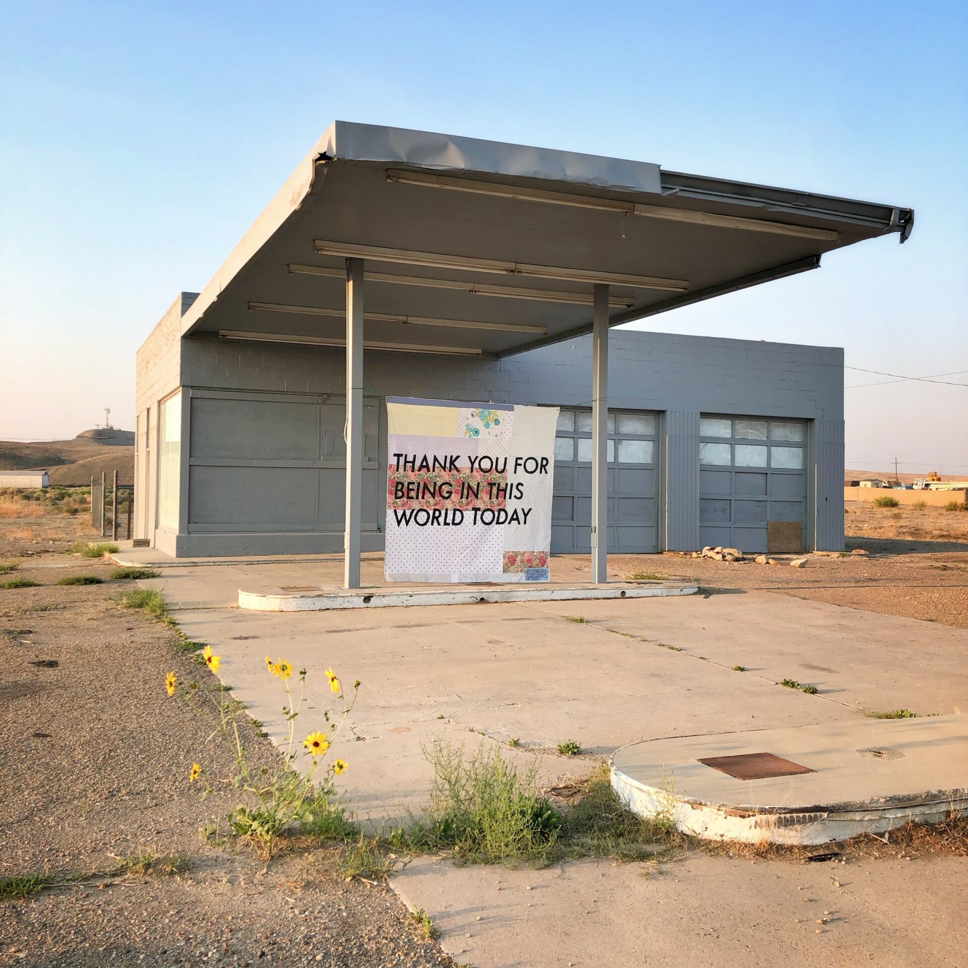 Since then, this project has grown in ways I never could’ve imagined. It has become my full-time job and received support from global corporations, donors, grants, media outlets, and individuals that make expansion possible. The writing in this project is always written, designed, and produced by me and is always shared in anonymous, free, and accessible ways. Through this project, I have shared tender yet honest poem-like affirmations on road-side billboards, airplane banners, semi-trucks, barges, urban wheat-pasted posters, stickers, yard signs, hand-made quilts, fliers, and murals all over the world. I have partnered with cities, schools, hospitals, prisons, and psychologists to integrate compassion into their operations and environments. I also work to create iterations of this work that humans can engage directly with in an intimate way – I have built “free flower shops” in public spaces and created a mailing service in which 100,000 people have received hand-addressed postcards with my written affirmations on them every month for over three years.