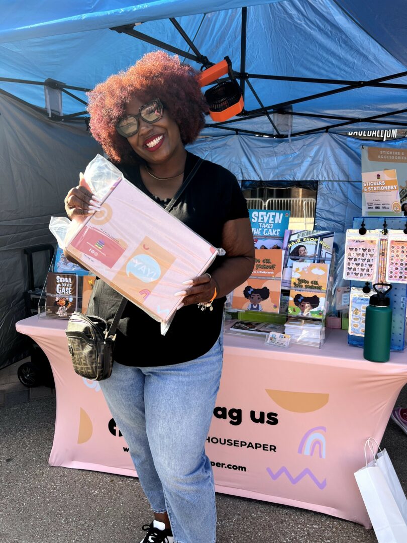 Girl with afro holding book: Round House Paper customer, Latrice Staten, poses with her purchase at a vendor event.
