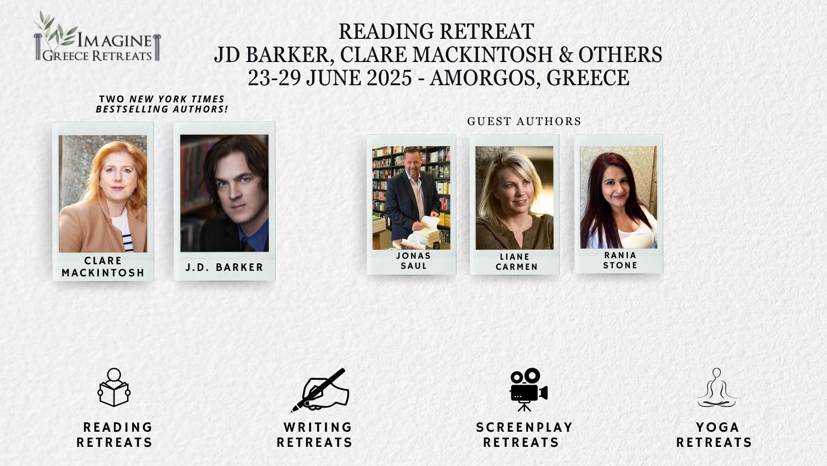 Reading Retreat with J.D. Barker, Clare Mackintosh, and others: June 23–29 at Lakki Village in Amorgos.
