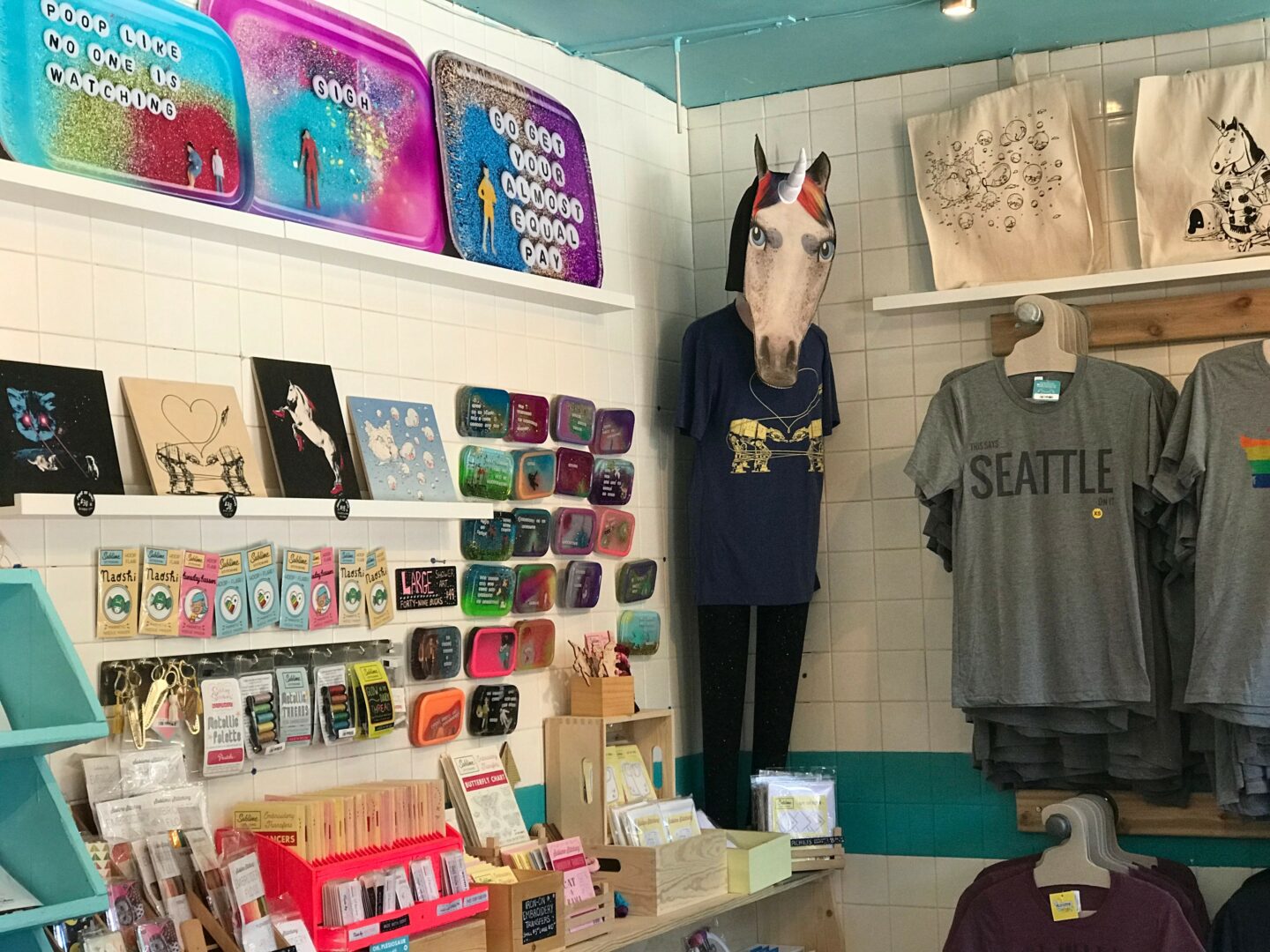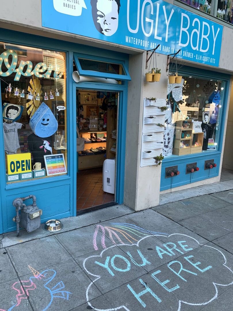 Now, 15 years later, I’m the owner of two retail shops in Seattle, WA that feature the work of independent artists (including myself and my husband). Our brand is called Ugly Baby and we make Shower Art – waterproof art you can hang in your shower with a suction cup. Our first storefront shares the name Ugly Baby and is our headquarters located in the historic Pike Place Market. We carry our own line of products: Shower Art and a wholesale line of items based on our most popular Shower Art themes. In addition, we carry the work of other independent artists and DIY craft kits and supplies. In the summer you can find me there doing rug tufting demonstrations and shooting yarn out of a gun & into a canvas.