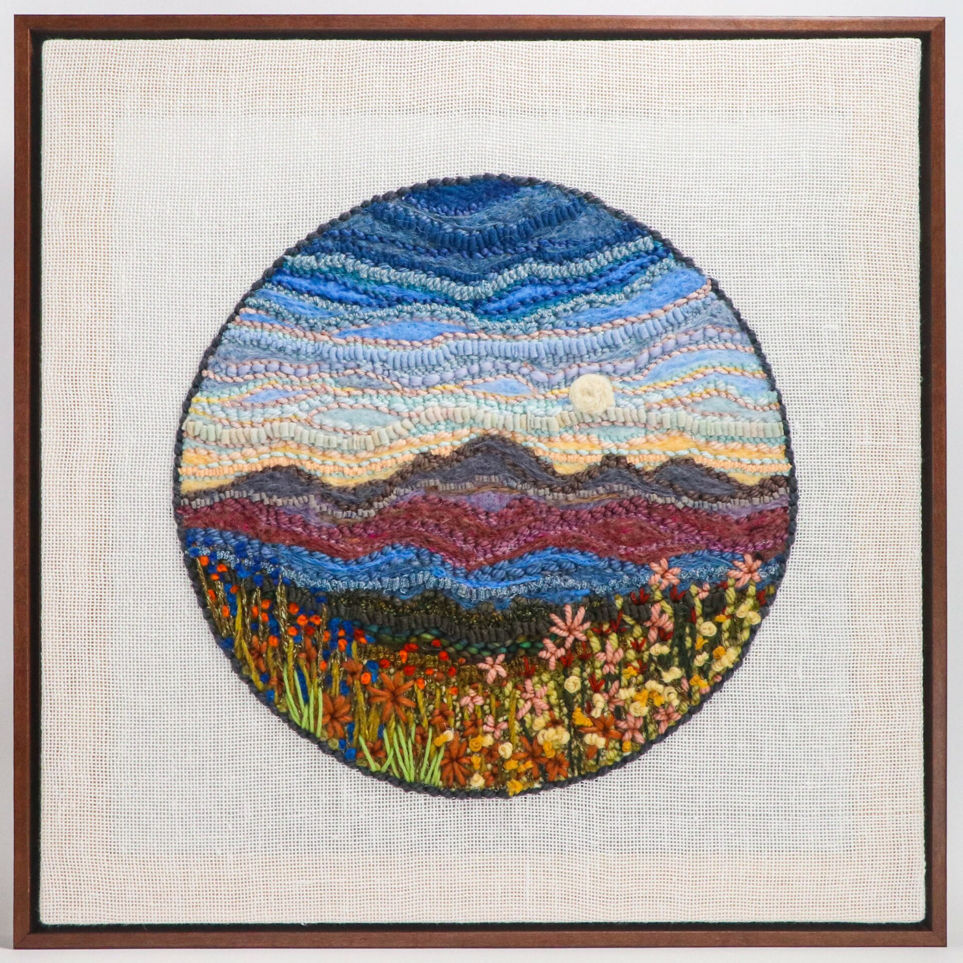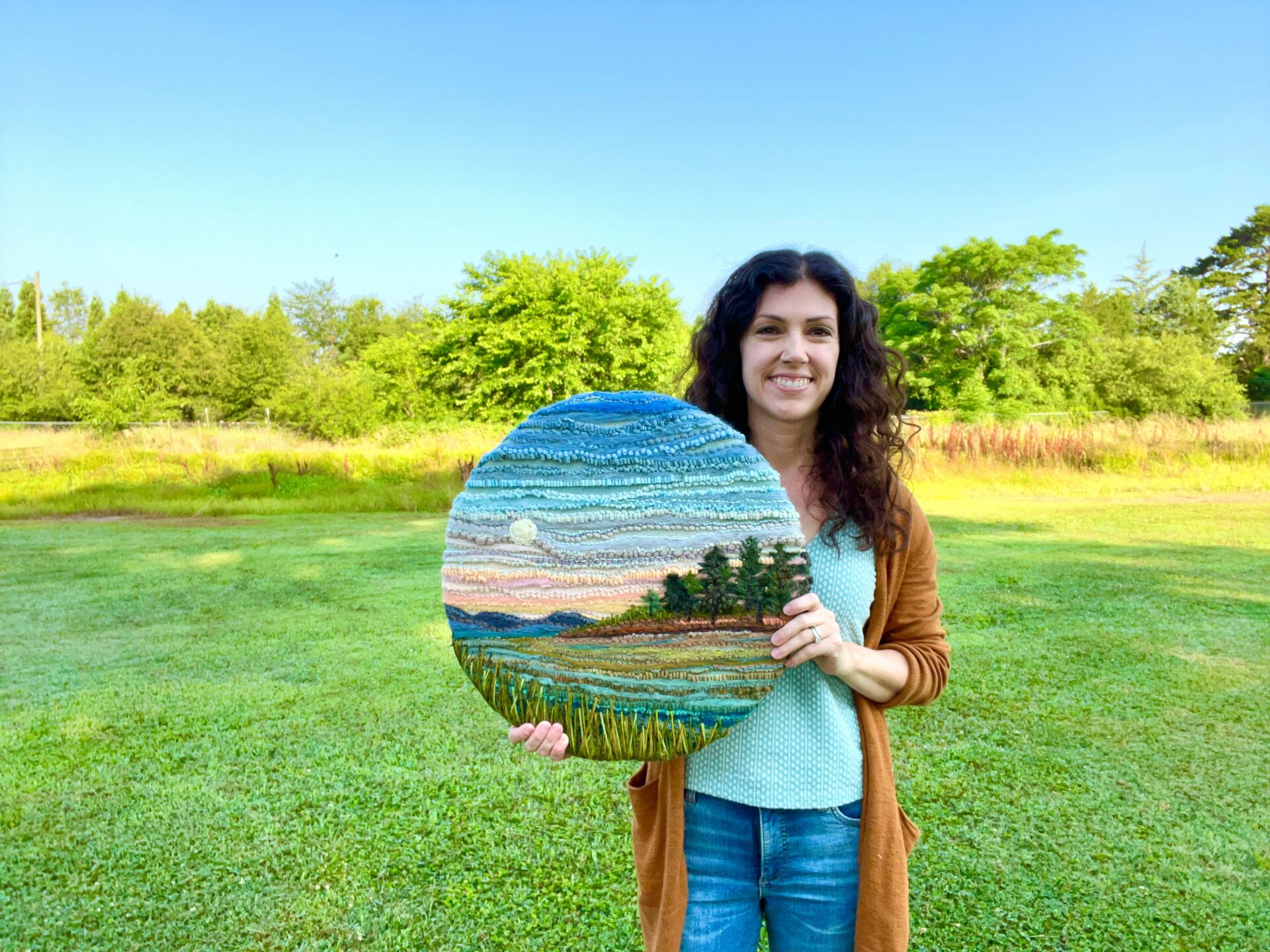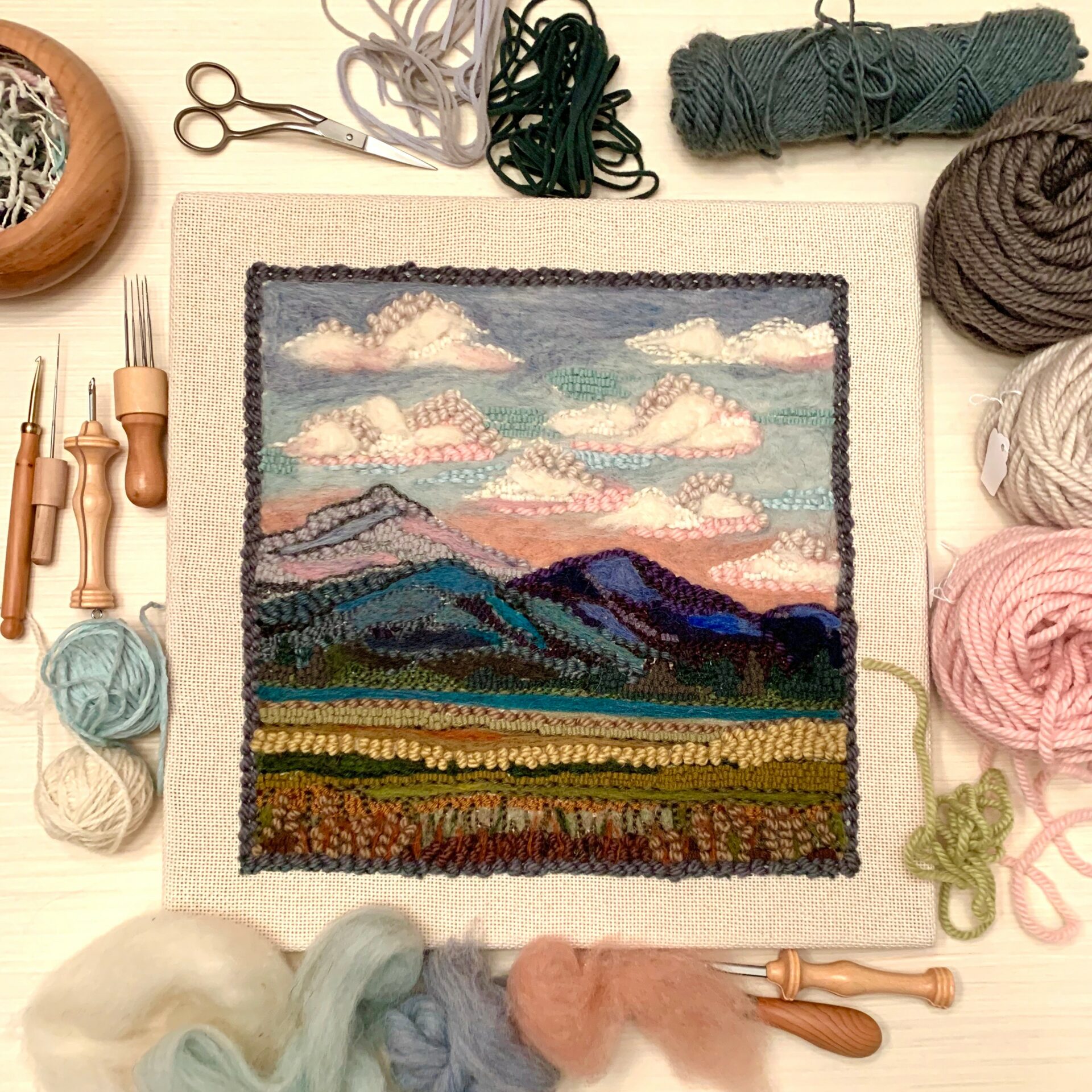 My fiber art career started out with 3D needle felting, then eventually honed in on 2D wool landscapes featuring scenes from the Southeast. In recent years, I’ve learned rug hooking, punch needle, and tufting, all of which have given me new ways to work, achieving different textures through each medium, and the opportunity to break all the rules by combining them.