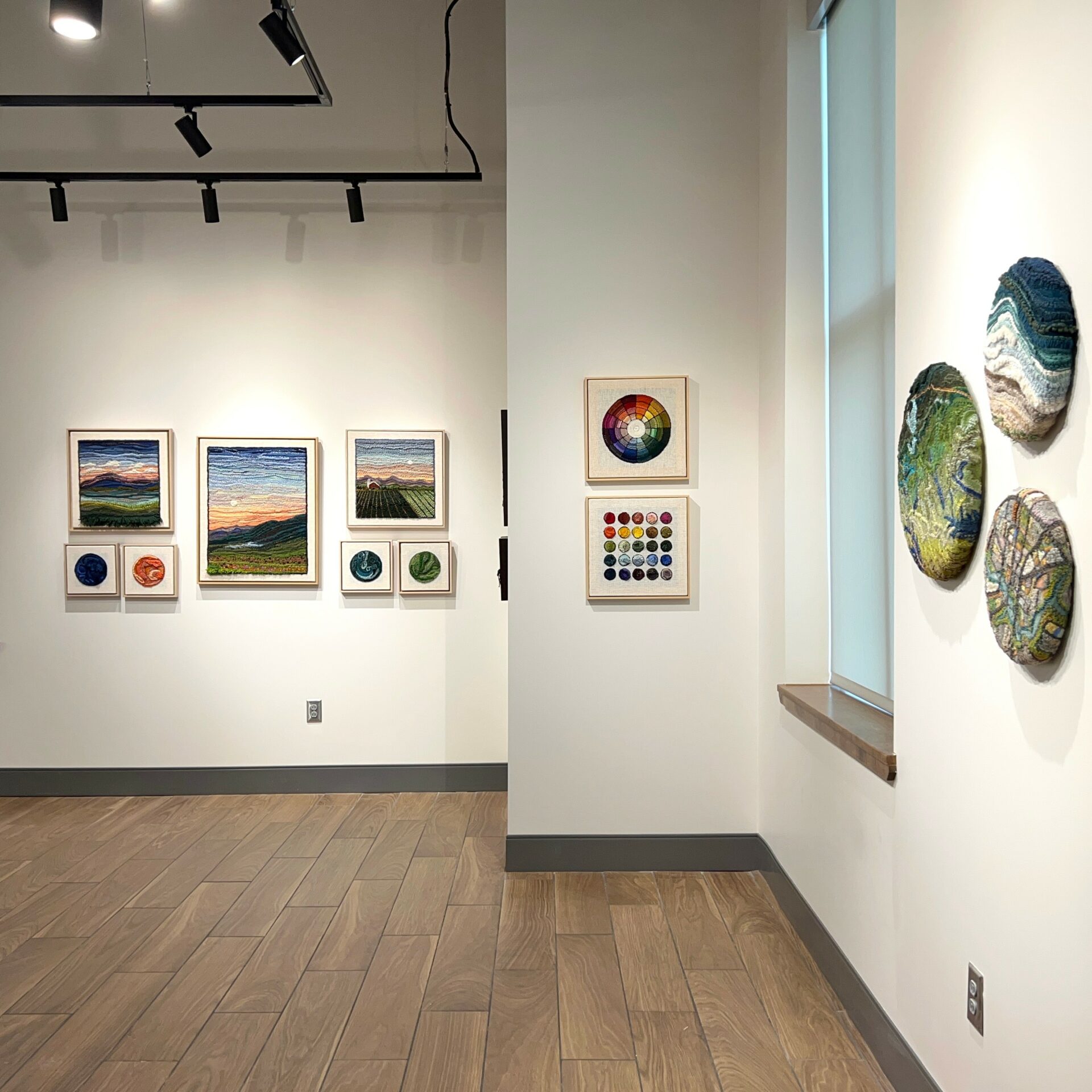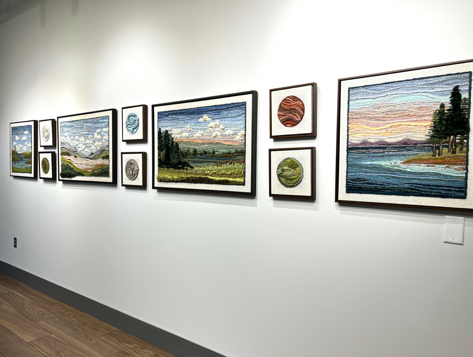 These highly textured landscapes are tediously stitched, felted, and woven together to create recognizable scenes, all created with fiber, yarn, and fabric.