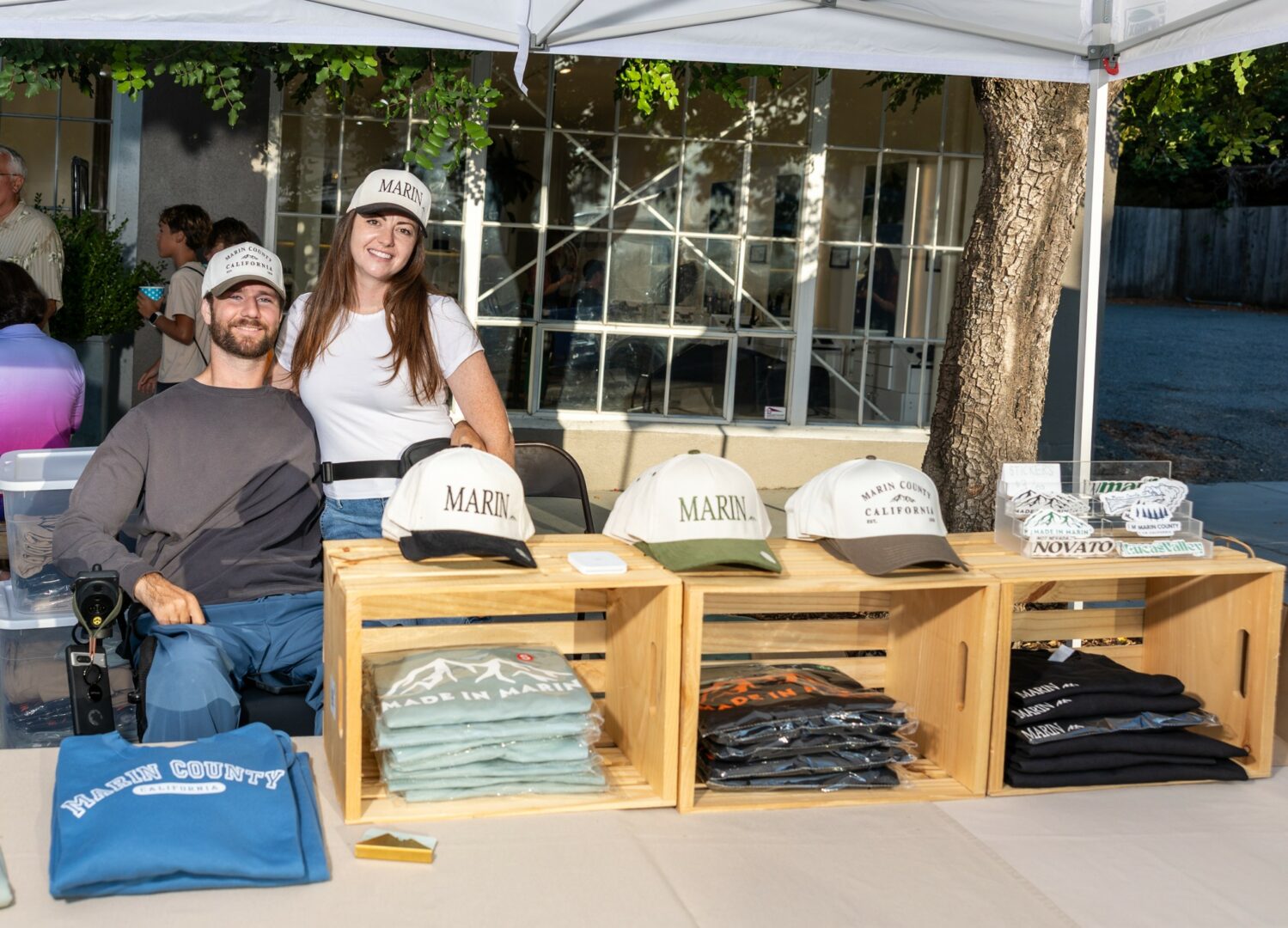 To set up these collaborations, we spend a lot of time networking, editing, and making plans on social media or via email. And on top of those emails, we run a full-on clothing business. Where we have customer service, pack orders, design and test products, and make all the items as well! We love to set up as vendors for farmers markets and local events to show off the amazing merch we create for MADE IN MARIN.