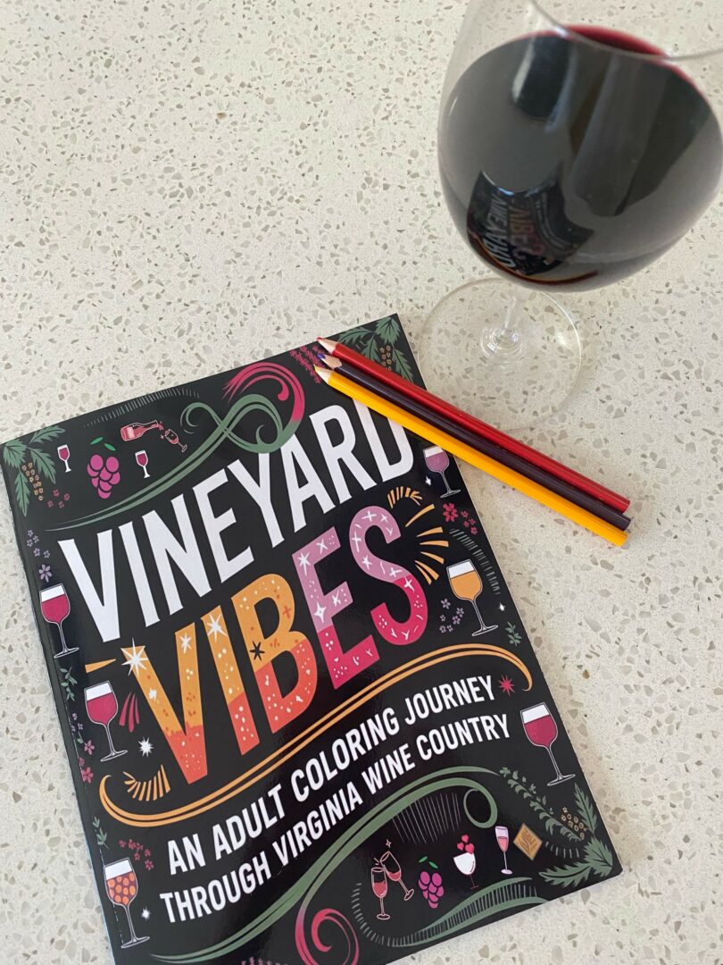 As I kept busy with my career in marketing, I’ve grown my social media following for Virginia Wine Know (on Instagram) and have thoroughly enjoyed continuing my wine journey. And, just this year – finally after many years of fitting it in – my love for wine, creativity, and mindfulness has come together in my new book, *Vineyard Vibes: An Adult Coloring Journey through Virginia Wine Country*. This adult coloring book, a new labor of love, is a celebration of Virginia’s wine culture and an invitation to slow down, reflect, and reconnect with yourself through color, art, and storytelling. It’s also inspired by my own journey toward mental wellness.
