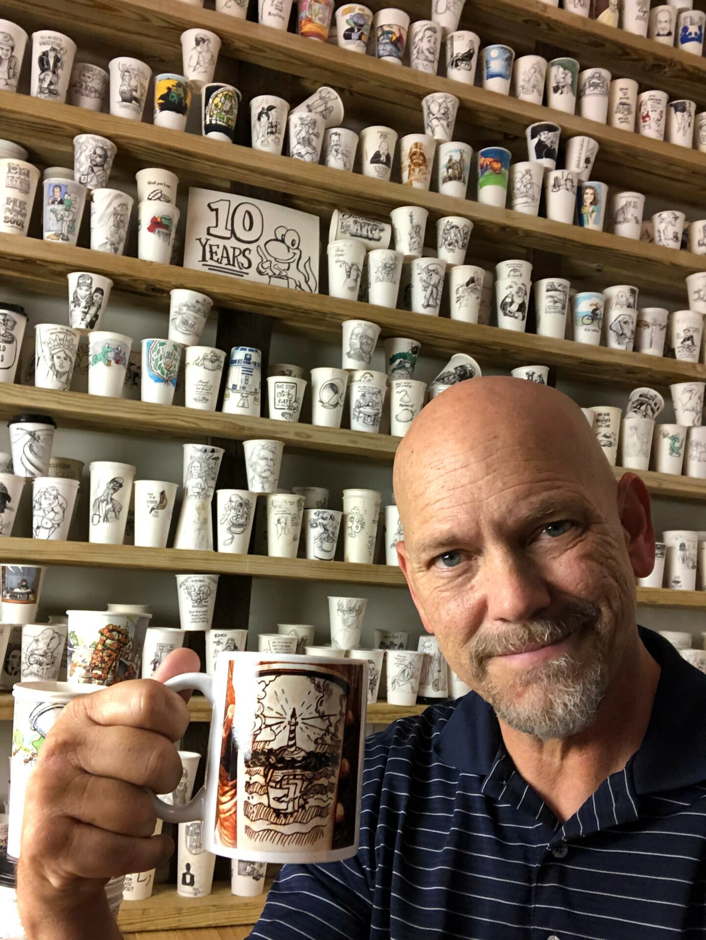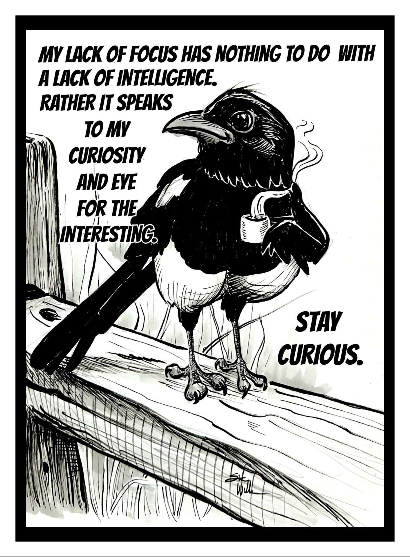 Although I recently took a sabbatical from this process, over the last 11 years I daily drew on coffee cups or did some kind of drawing and posted them on social media to be seen by a small but loyal group of followers. Many were coffee related but most had some connection to a quote or thought from recent studies and even some news stories. This daily push to create is hard to step away from, so I end up creating something anyway. It has improved my drawl skills and sharpened my thought process.