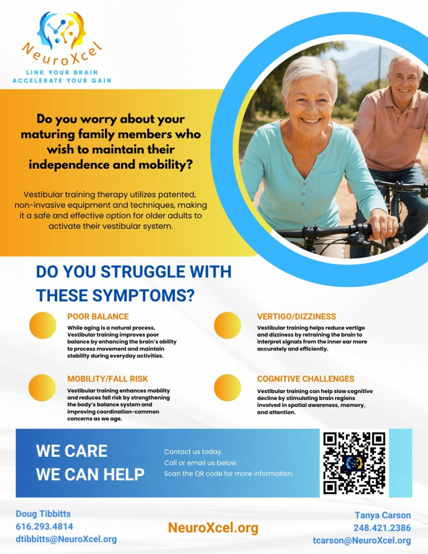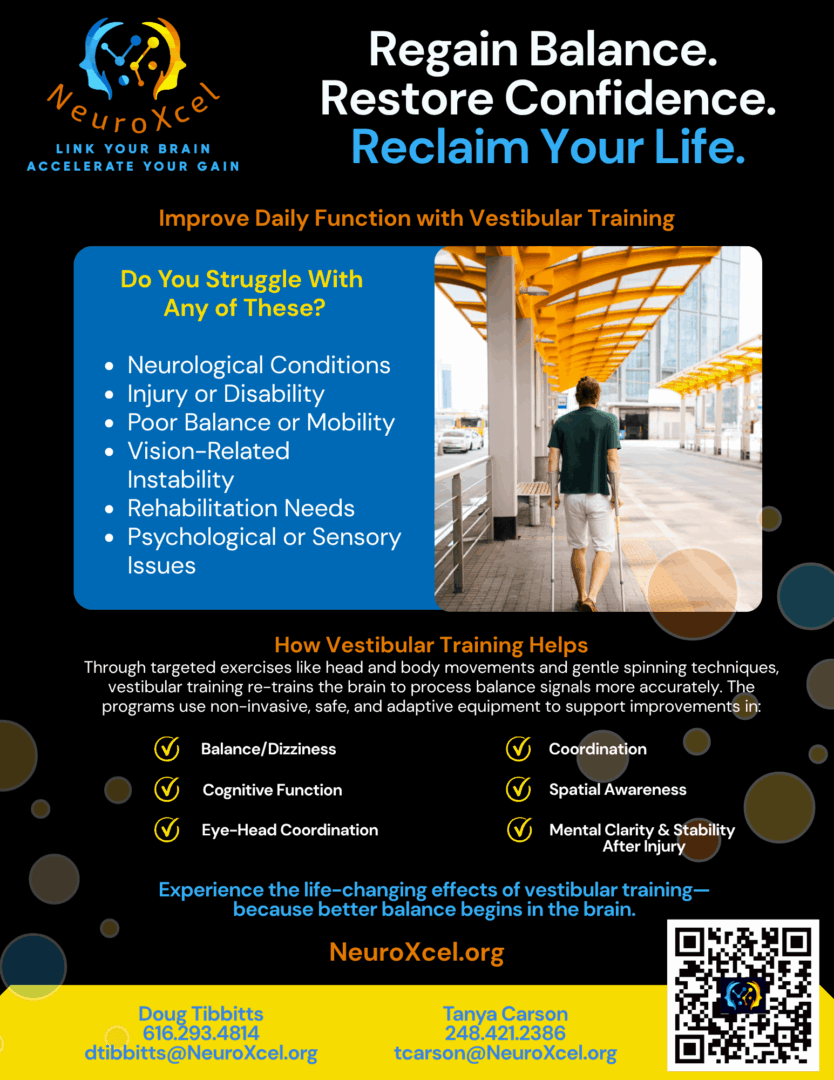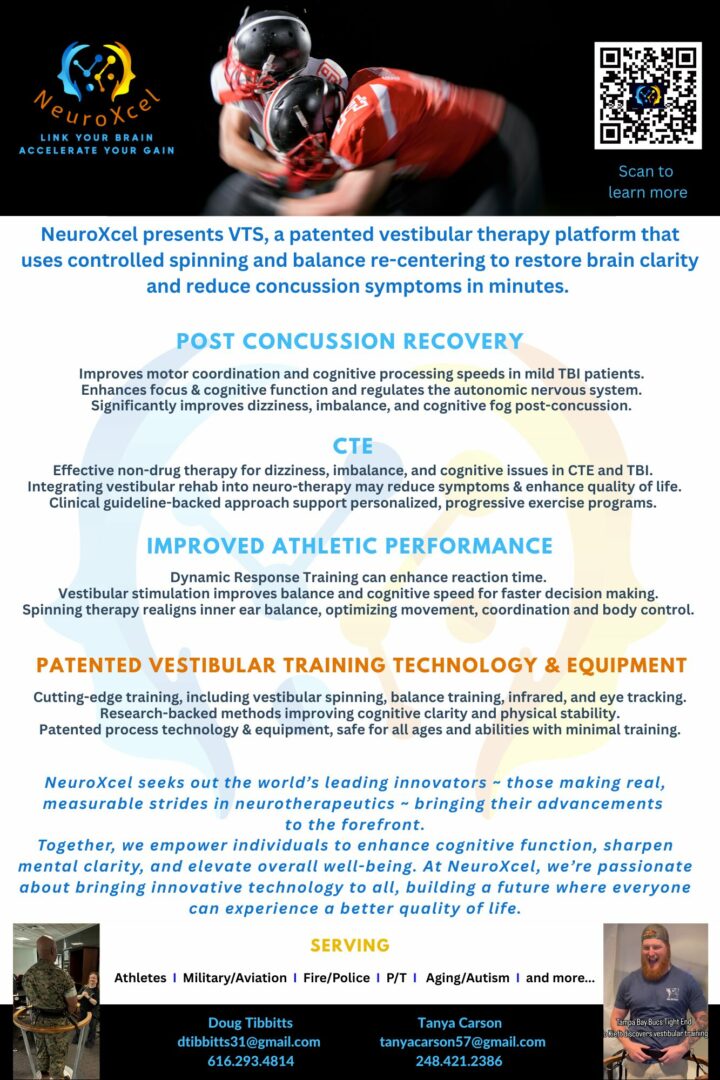 As for NeuroXcel, we all know someone that this technology can help. Whether it’s a car accident head trauma, your son playing school sports, your brother or sister is in law enforcement or the military and would benefit from chaos training and better reaction skills to save lives, to an aging family member that may be a fall risk or suffering from vertigo or early dementia, I would welcome a conversation with anyone wanting to learn more. I have websites and contact info available.