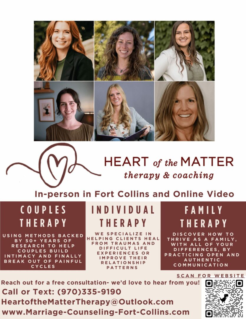 At Heart of the Matter Therapy and Coaching, we are a team of highly-trained relationship therapy specialists who practice science-backed and compassionate methods of couples therapy. With advanced training in the most evidence-based methods, including Emotionally Focused Couples Therapy (EFT) and Gottman Method Couples Therapy, we use the most effective methods in our practice to move couples toward secure, joyful relationships. We help couples find a way out of the patterns that they’re stuck in by learning how to communicate in more authentic and vulnerable ways. New ways of communicating restructure the very foundation of relationships and change our clients lives! We offer couples, individual, and family therapy in Fort Collins and online throughout the state.